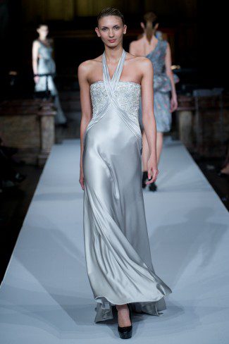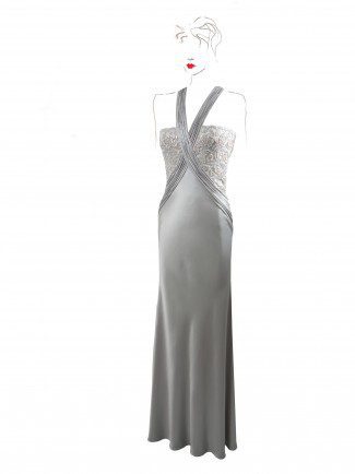A Gainsborough Grey silk satin long evening dress with clear crystal ‘rosette’ hand beading on the bodice