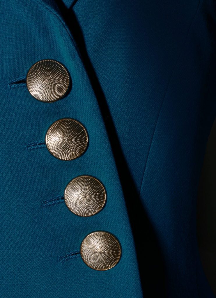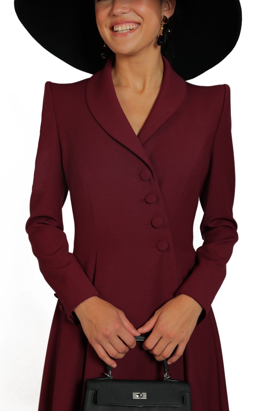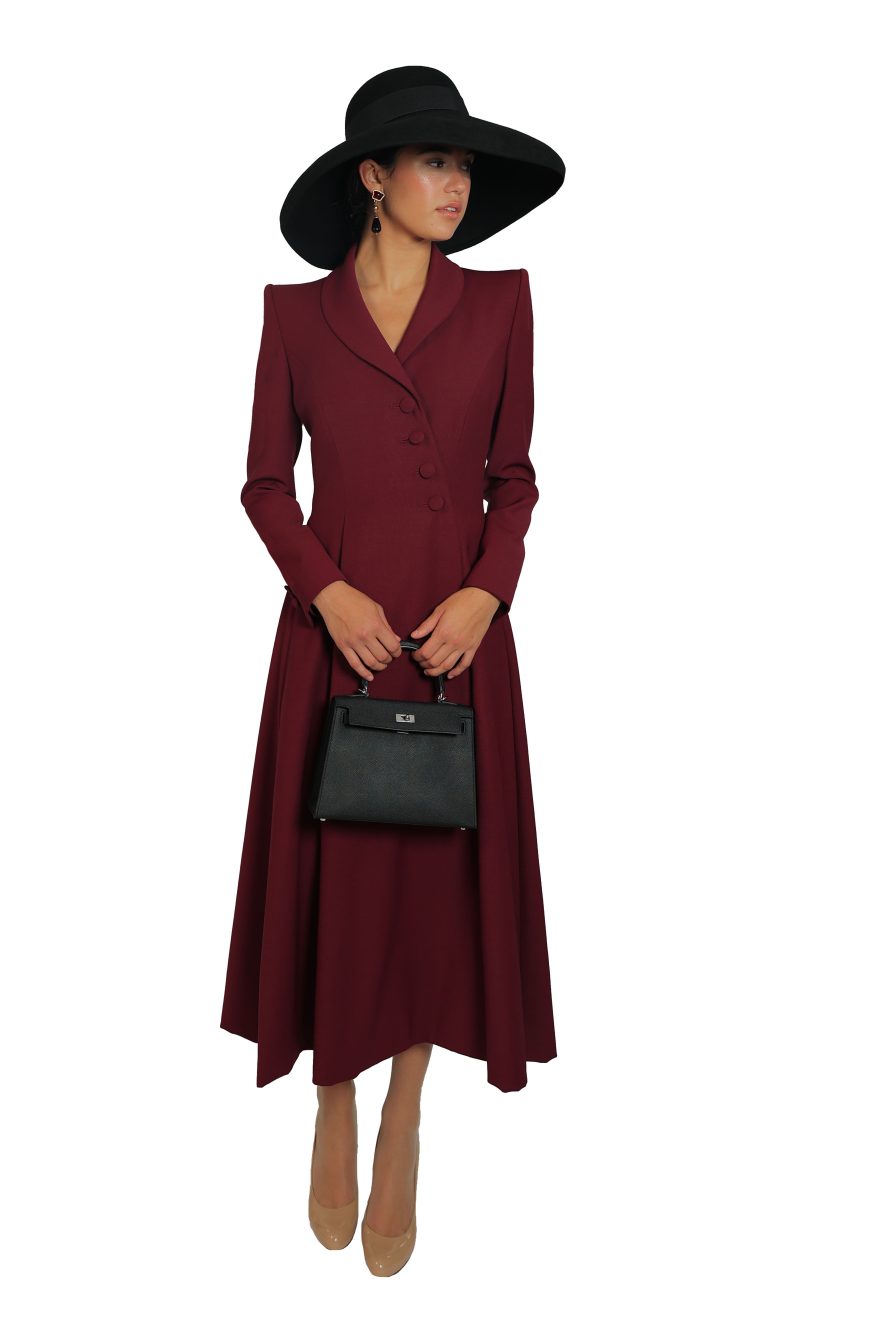 A clever diagonal fastening of dimpled gold buttons adds further interest to this sharp coatdress.