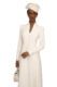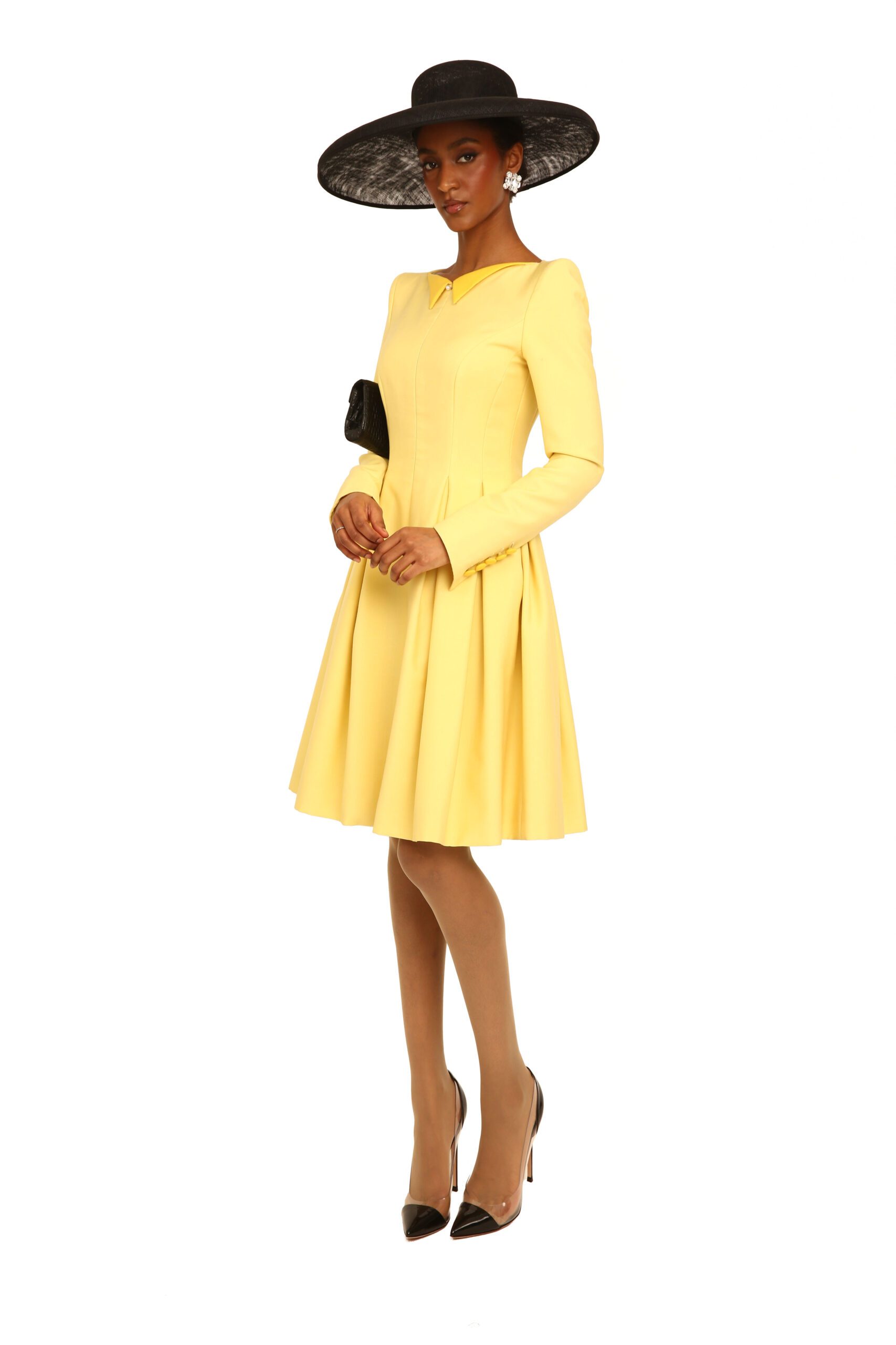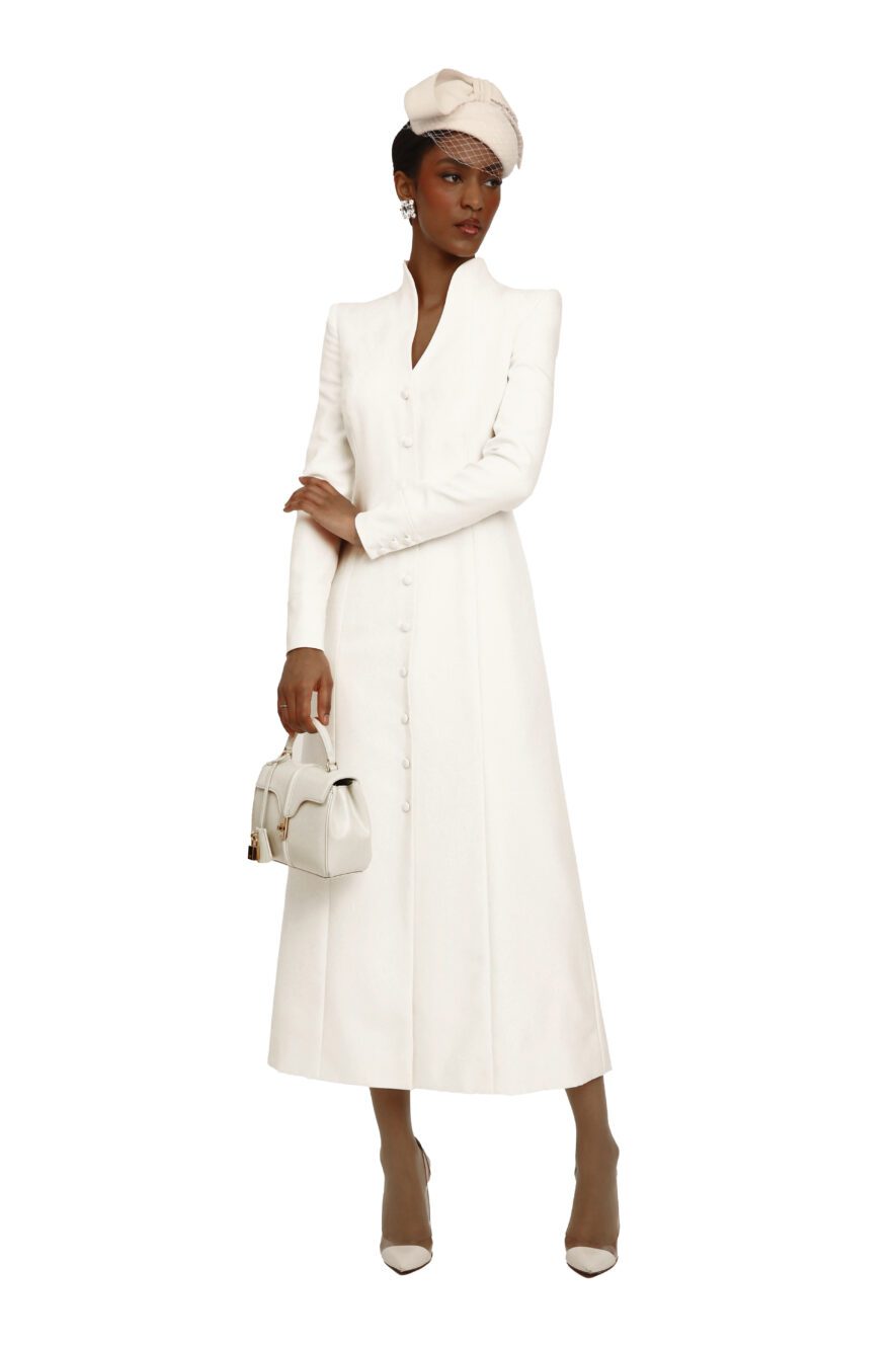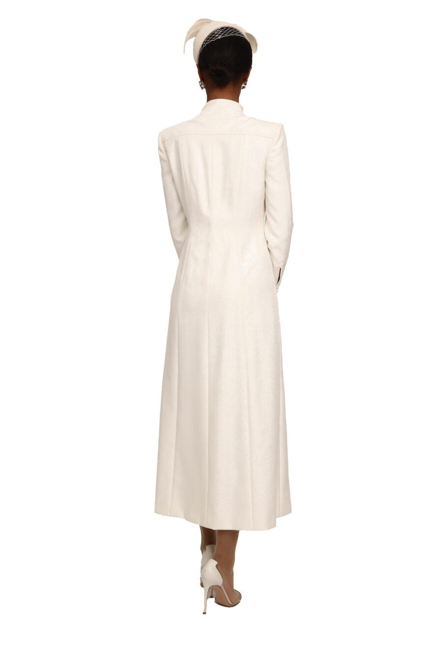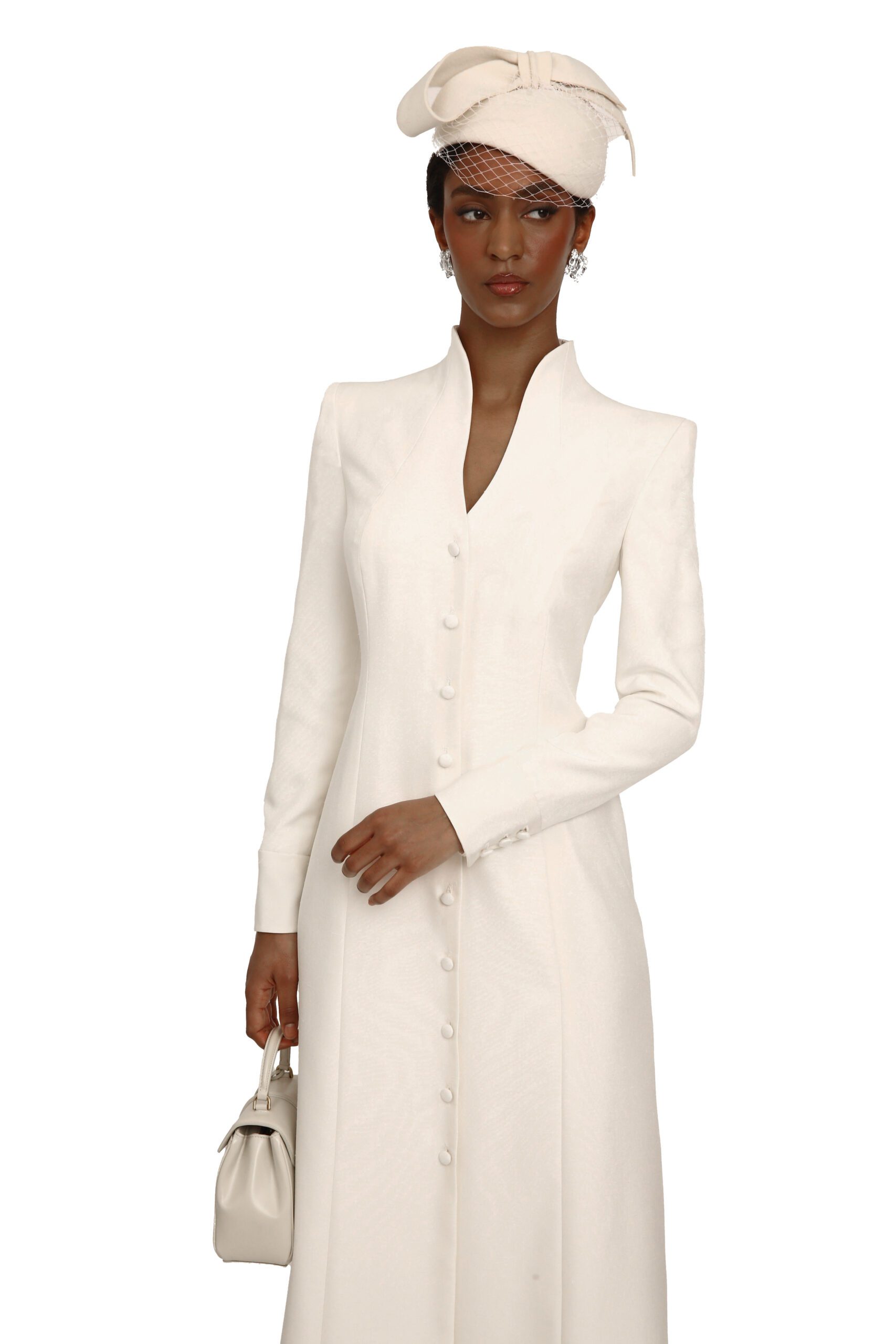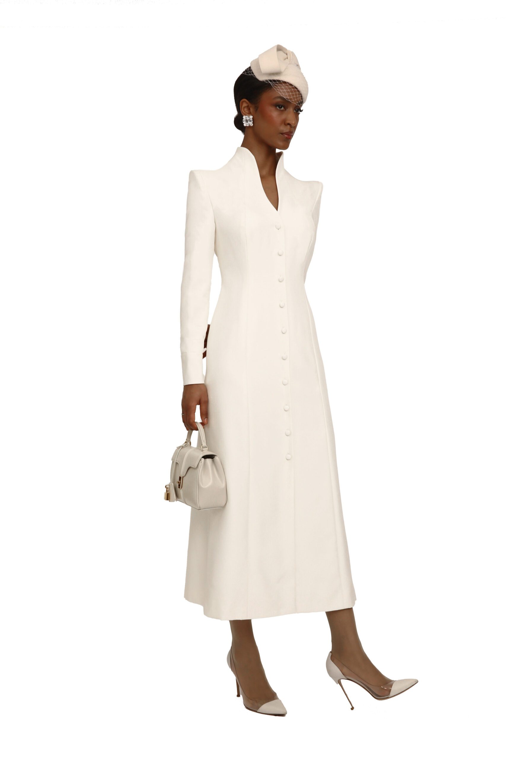 The high, stand collar opens into a subtle high V at the front, framing the neckline with quiet sophistication. Long, streamlined sleeves and a gently flared skirt create graceful movement, giving the piece a poised, statuesque presence.