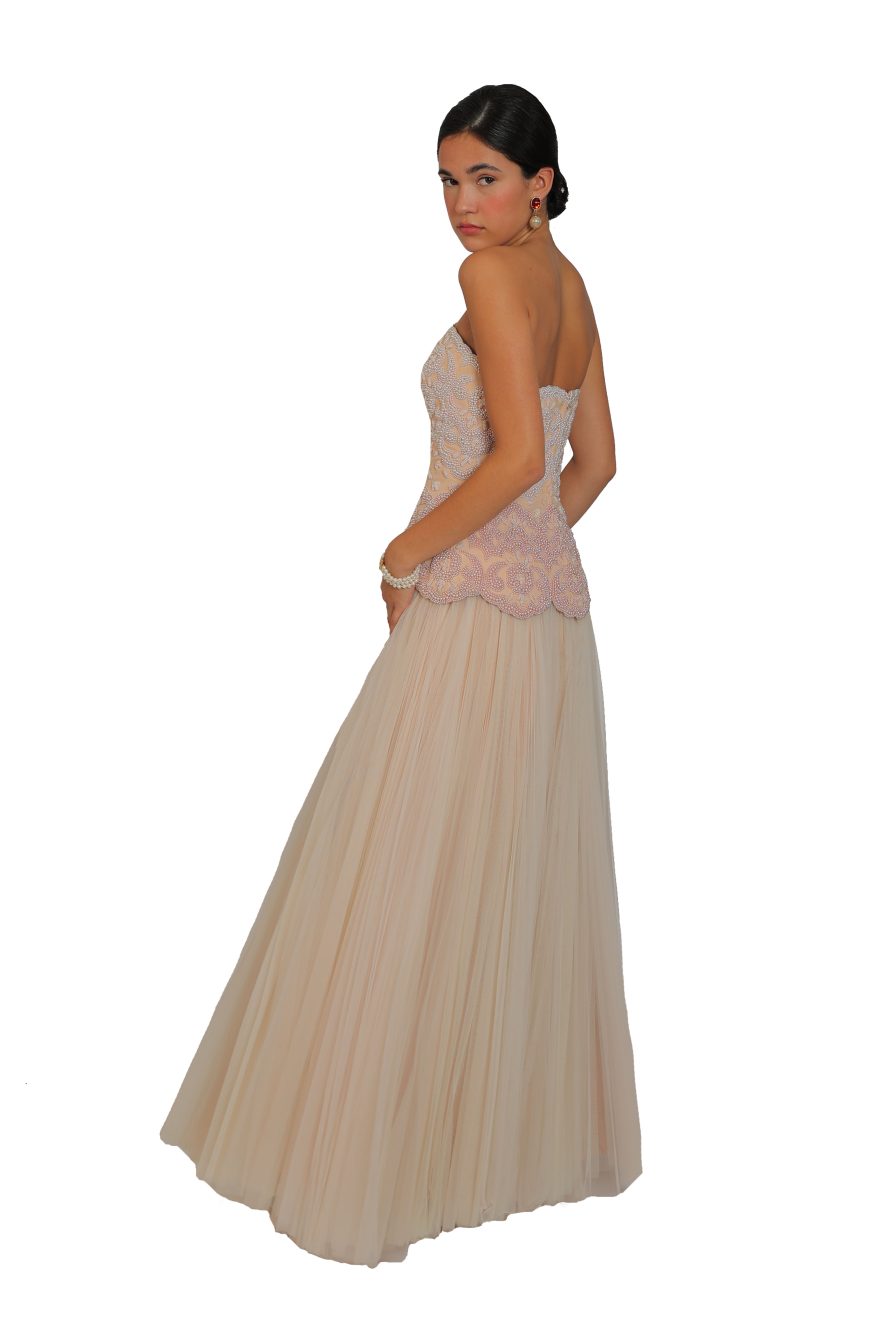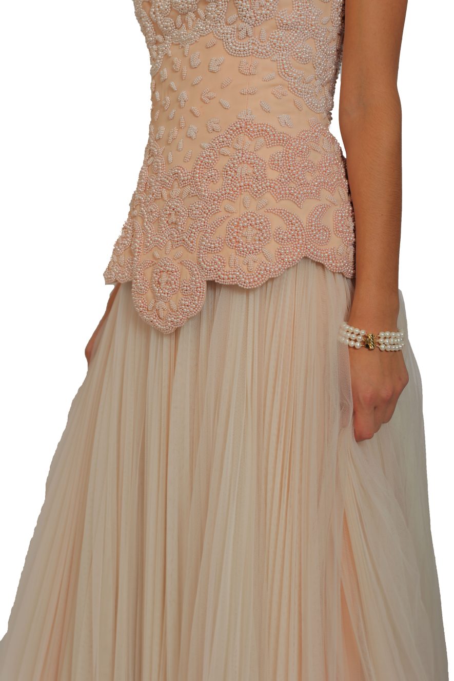 An archive piece featuring hand beaded ombre effect corset and a floaty silk tulle maxi skirt