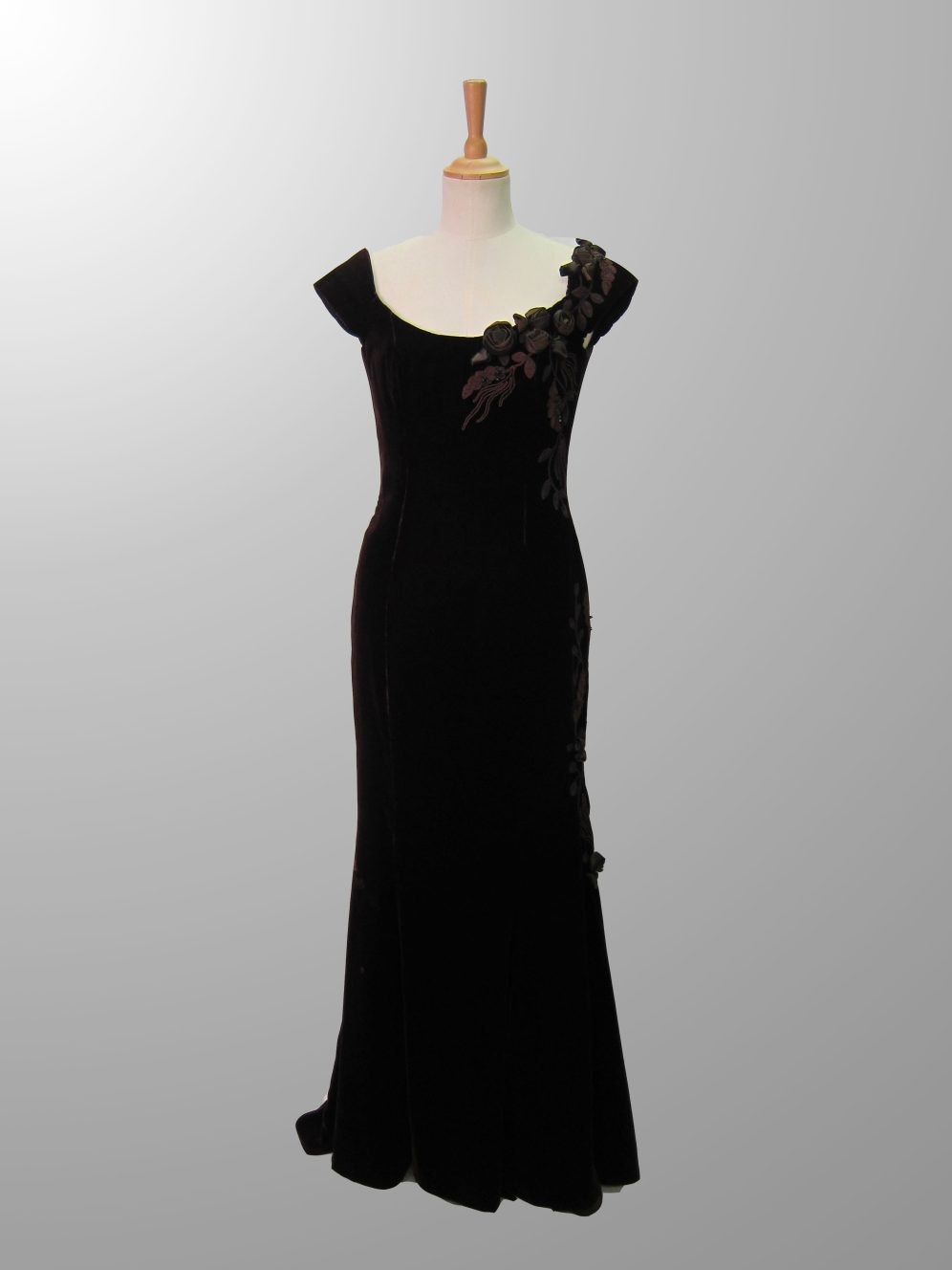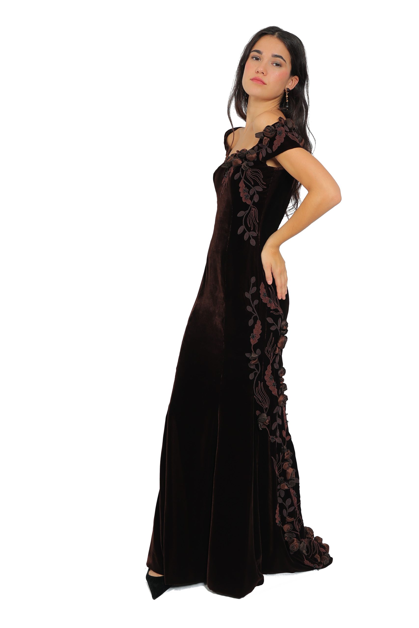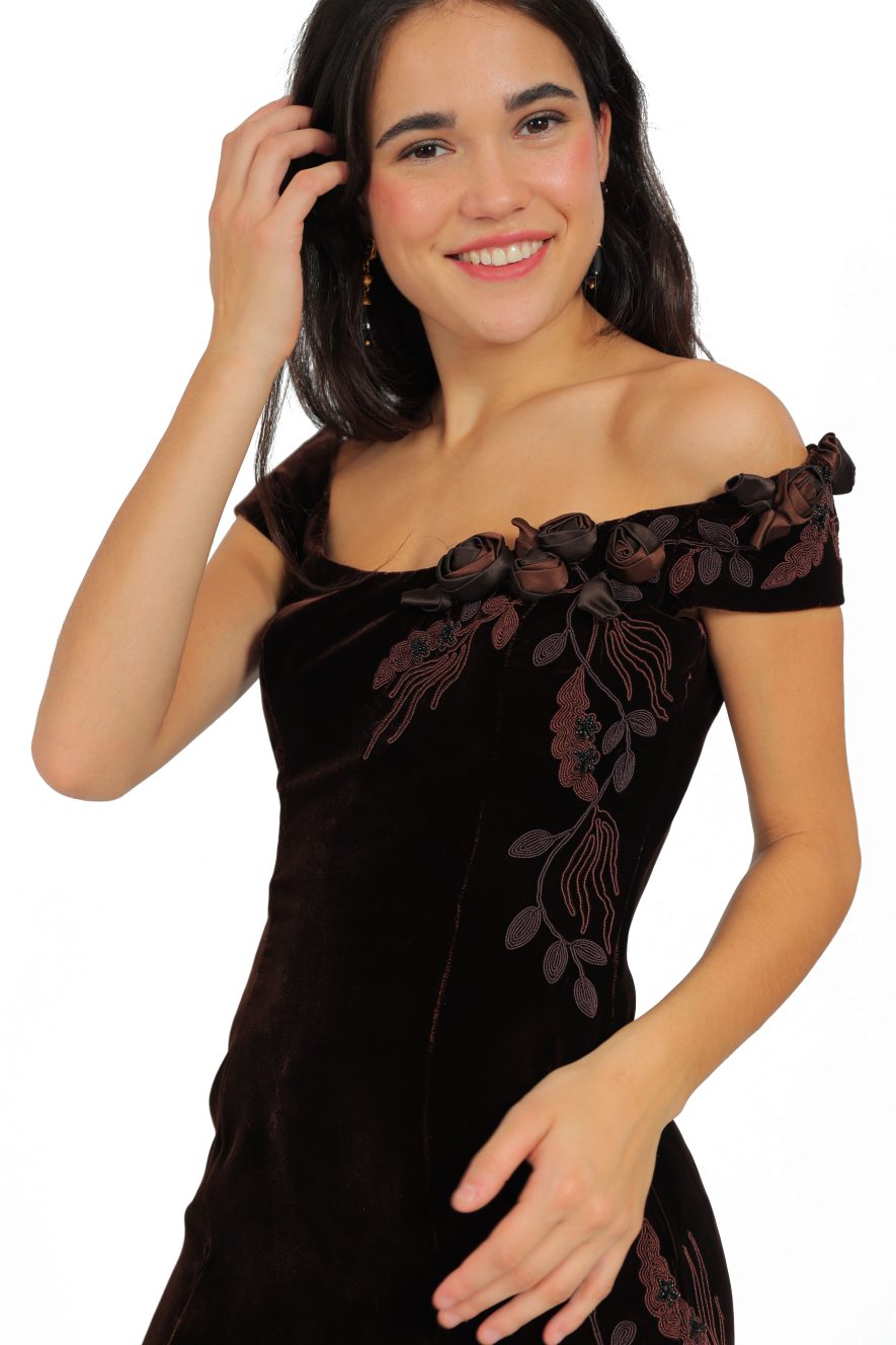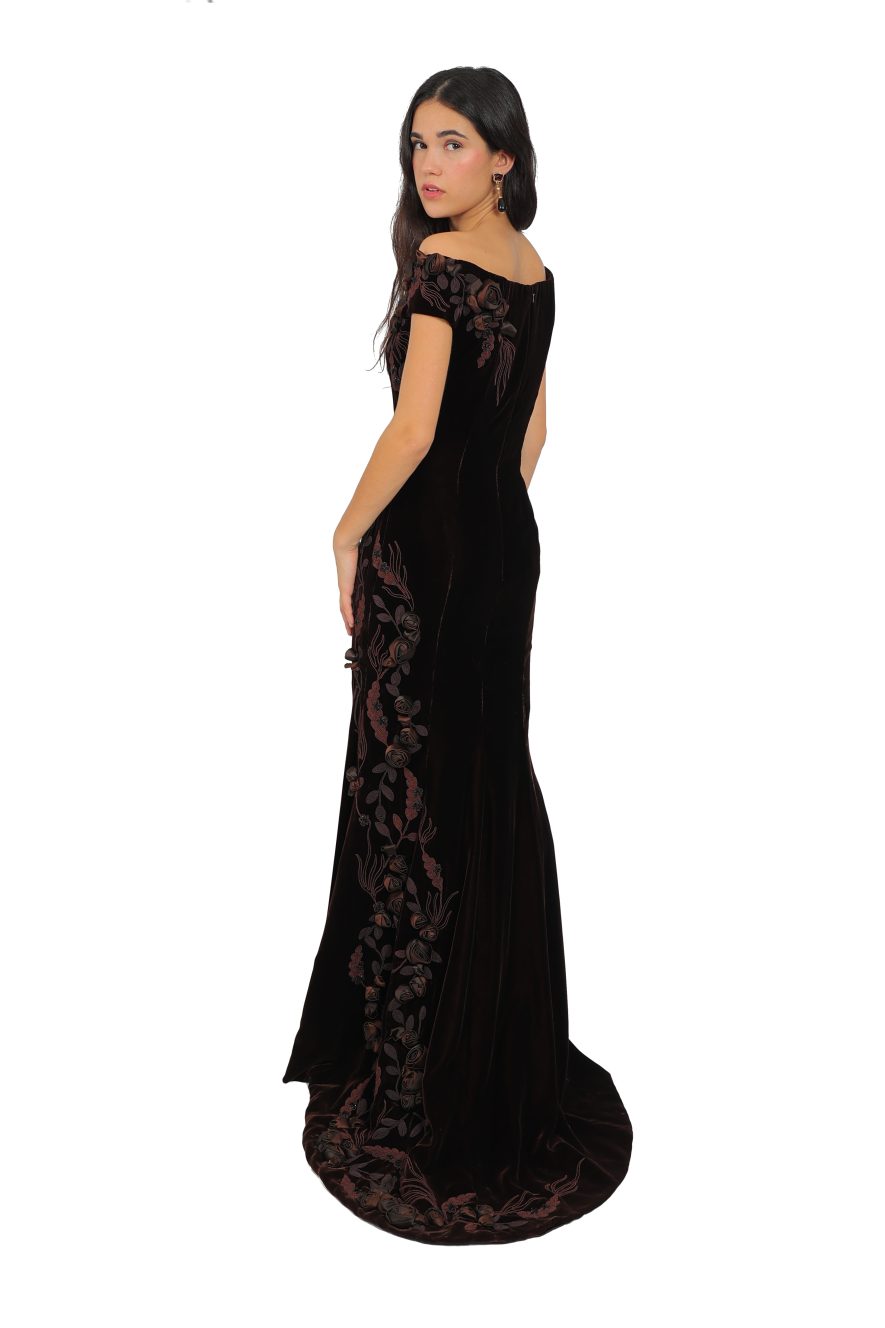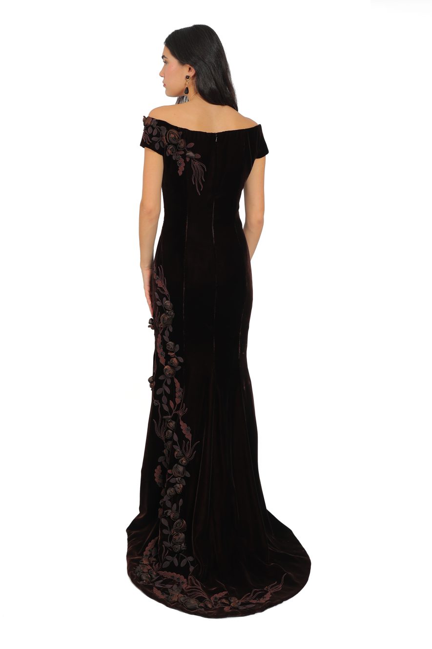 Rich chocolate silk velvet adorned in handmade roses and embroidery