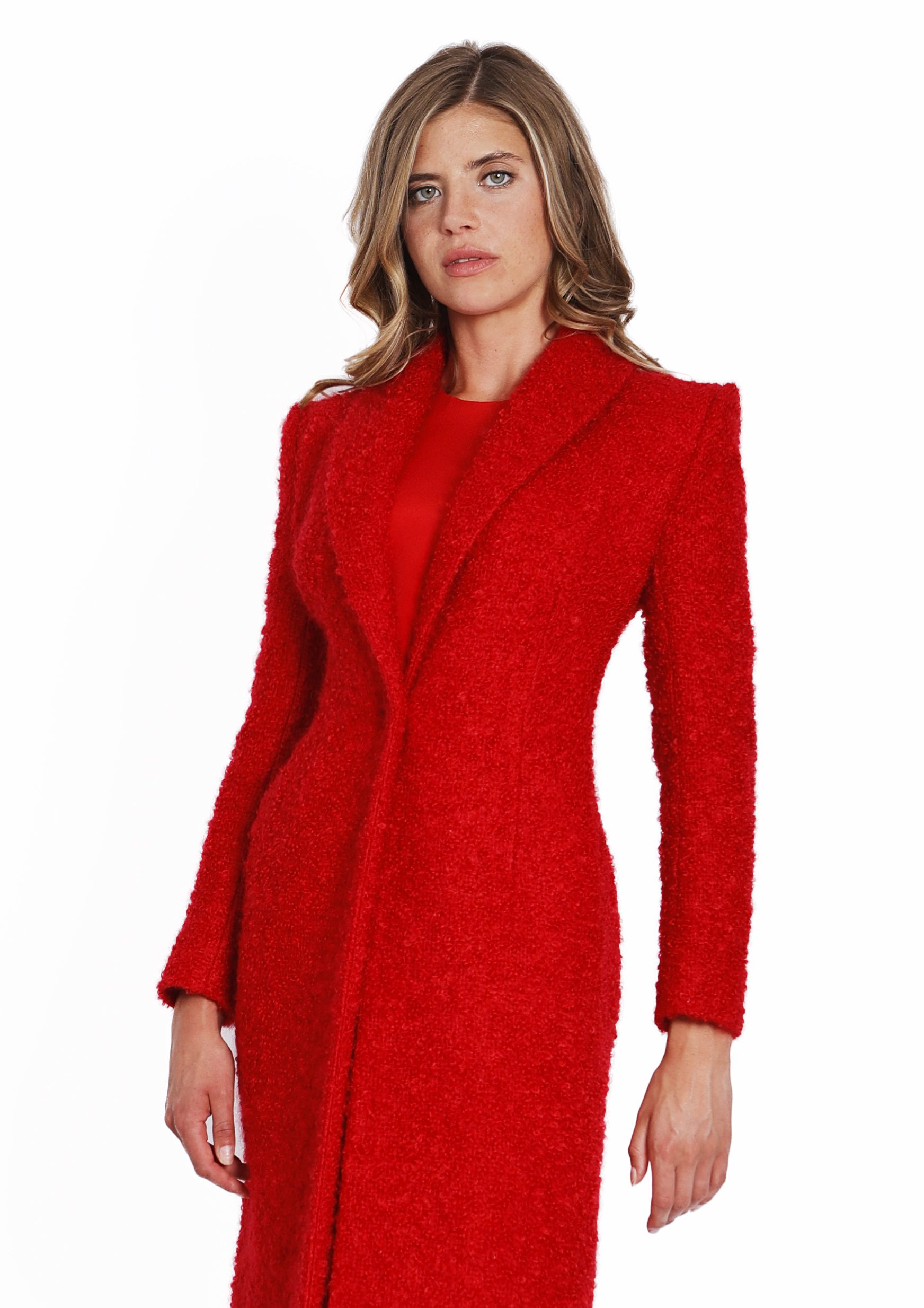 An ultra flattering lipstick red mohair and wool coat with gentle pink undertones is tactile and cosy, yet super structured around the shoulder to flatter.