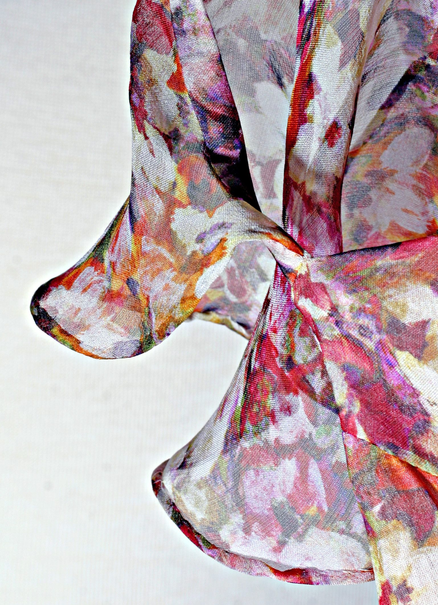 A cool, swirling summer garden party dress with a gently scalloped, peekaboo cap sleeve’ and statement, draped bow.