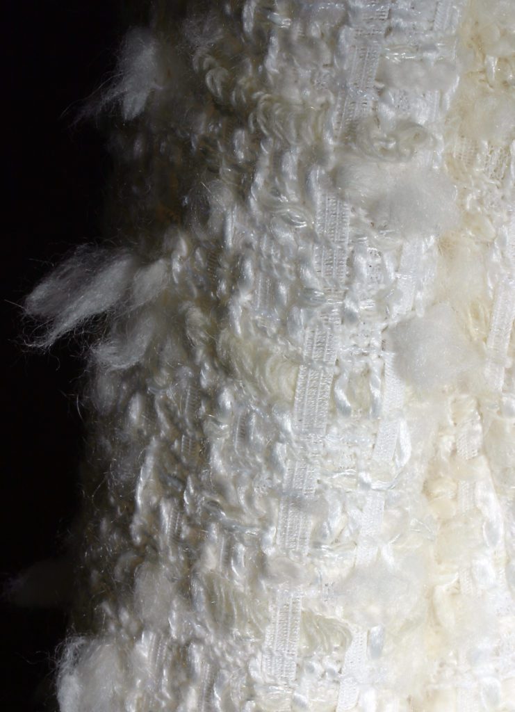 A sharply tailored coatdress cut in an ivory ‘light as air’ tactile tweed fabric with a soft roll collar and feminine, flirty full skirt.