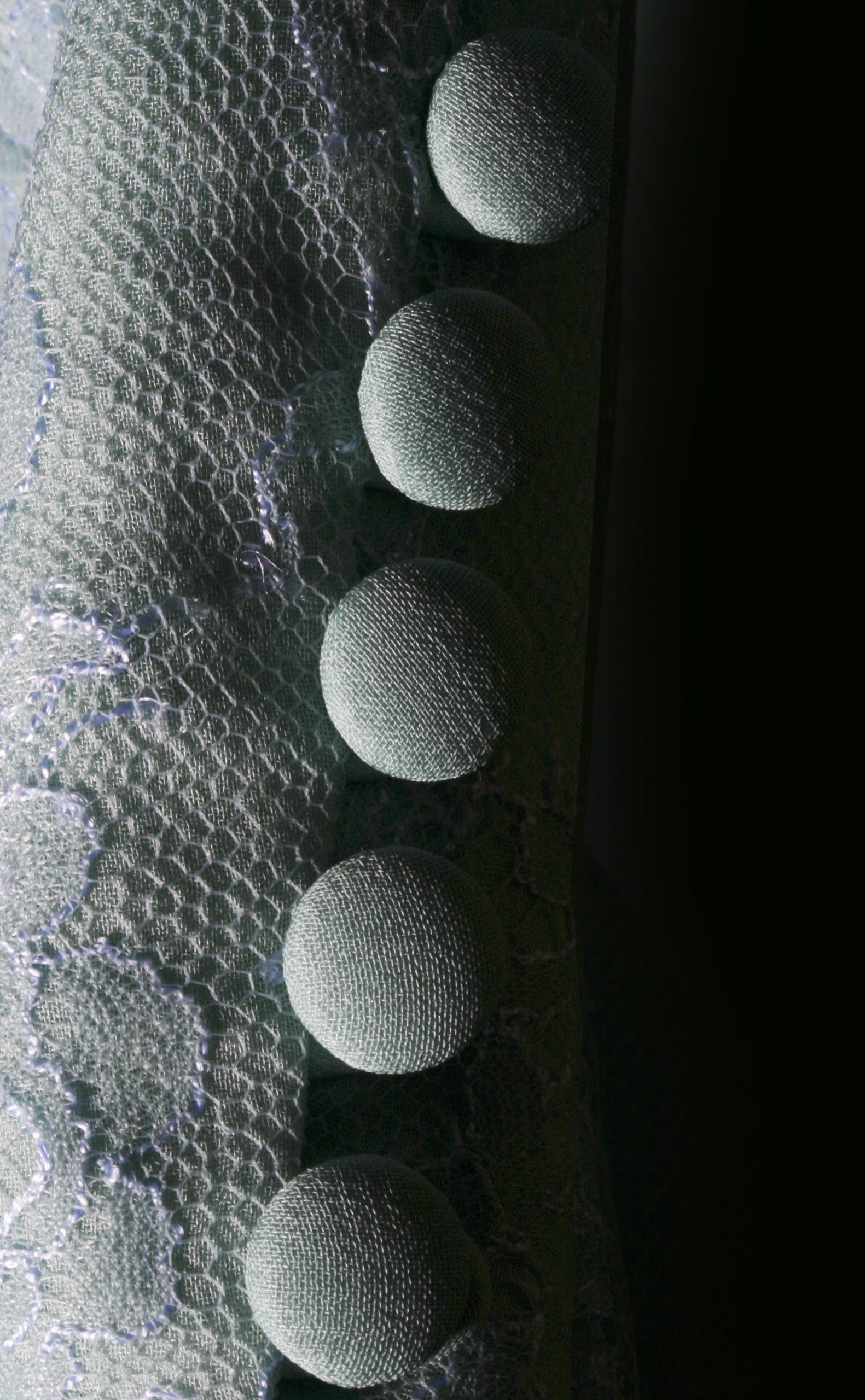 A floaty and feminine mid-calf summer dress in aquamarine georgette with pretty Chantilly lace details around the waist, peplum, neckline and elongated buttoned cuffs.
