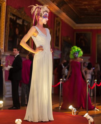 A powder blue hand ruched silk georgette long evening gown with swirling details around a curvaceous silhouette.
