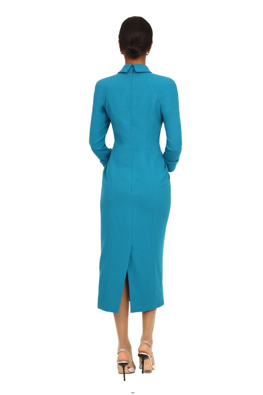 This elegant midi dress features a sleek, tailored silhouette that beautifully contours the body for a refined and sophisticated look. Designed with a structured Peter Pan collar, long fitted sleeves, and subtle waist shaping, it offers timeless polish with a modern edge. Perfect for formal events or elevated daytime occasions, itβs a statement piece that exudes confidence and effortless grace.