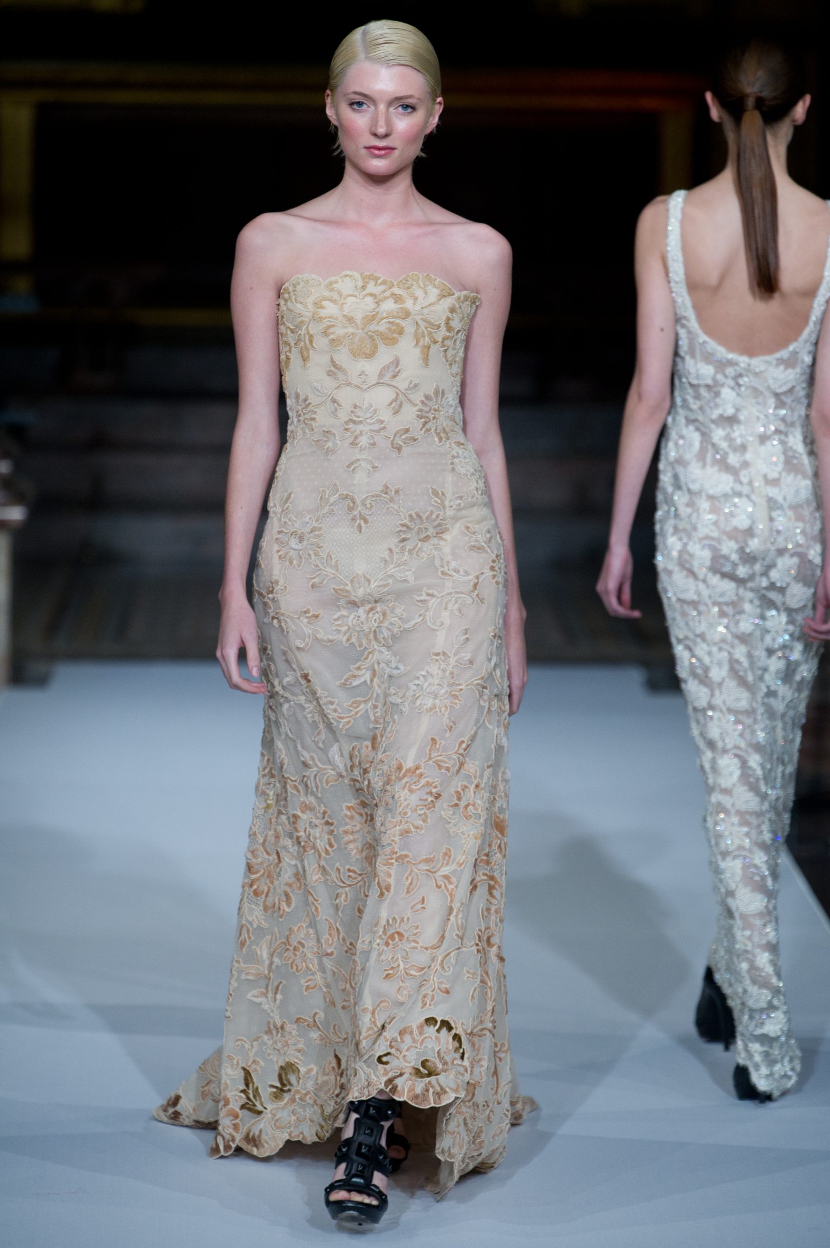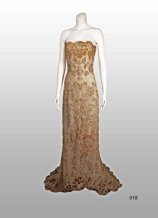 A dramatic lace evening gown in warm honey tones exquisitely hand embellished with chenille embroidery covering the full length to full train. #SS21
