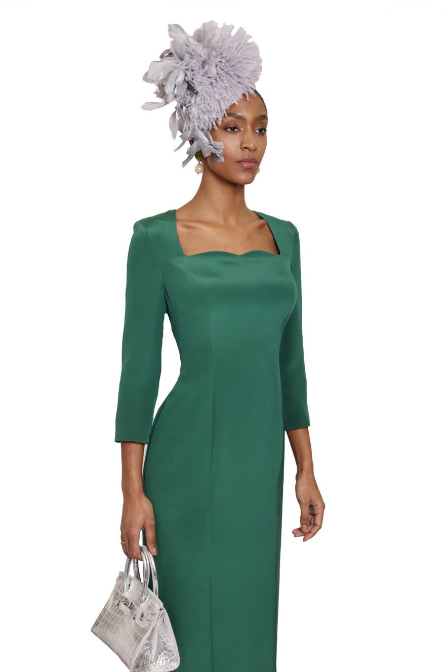 An emerald green silk marocain pencil dress with a sweetheart neckline and three-quarter sleeves.