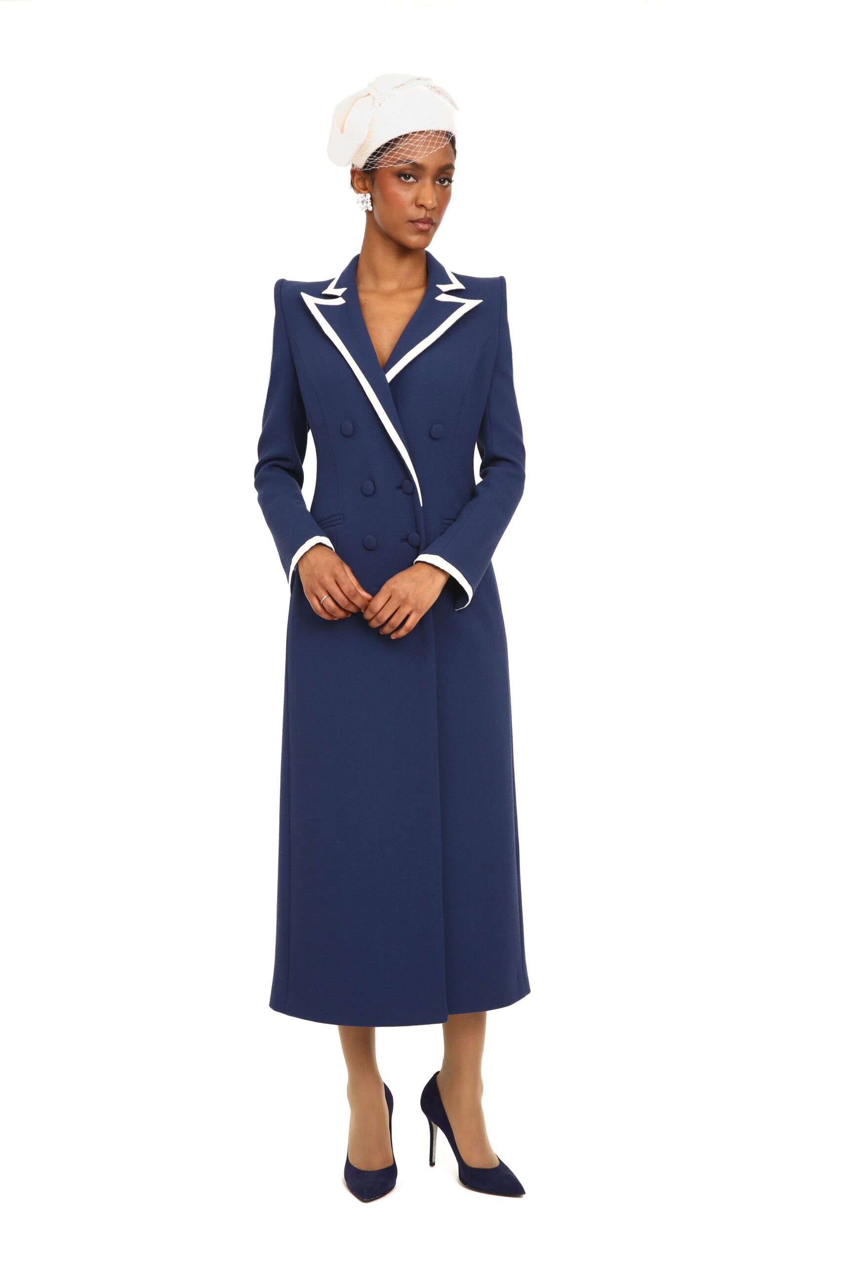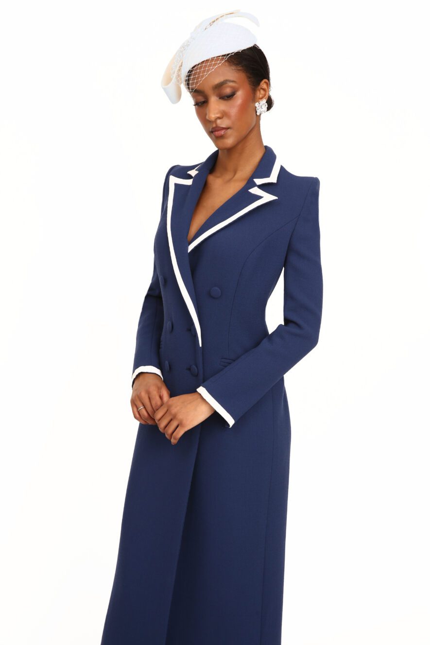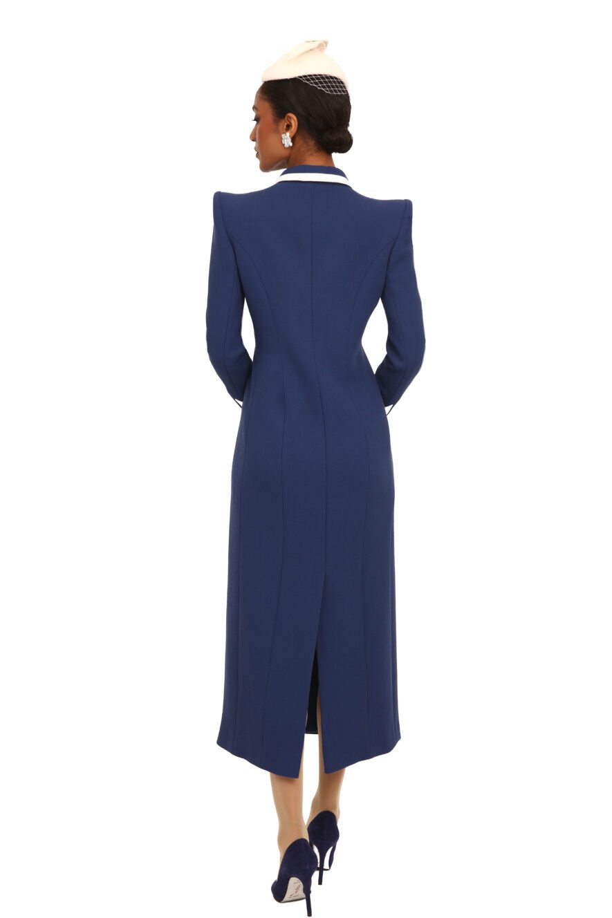 An impeccably tailored, hand-crafted couture coatdress defined by precision. The silhouette is elongated and sculpted through the bodice, with sharp, structured shoulders and clean princess seams that contour the waist before falling into a graceful, fluid midi-length skirt.