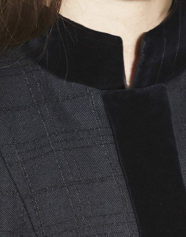 A sharply fitted jacket in a textured fine navy wool, with navy silk velvet stand-up collar, placket and cuffs
