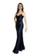 A figure-hugging midnight navy silk satin evening dress hangs on spaghetti straps and falls to a swirling fishtail