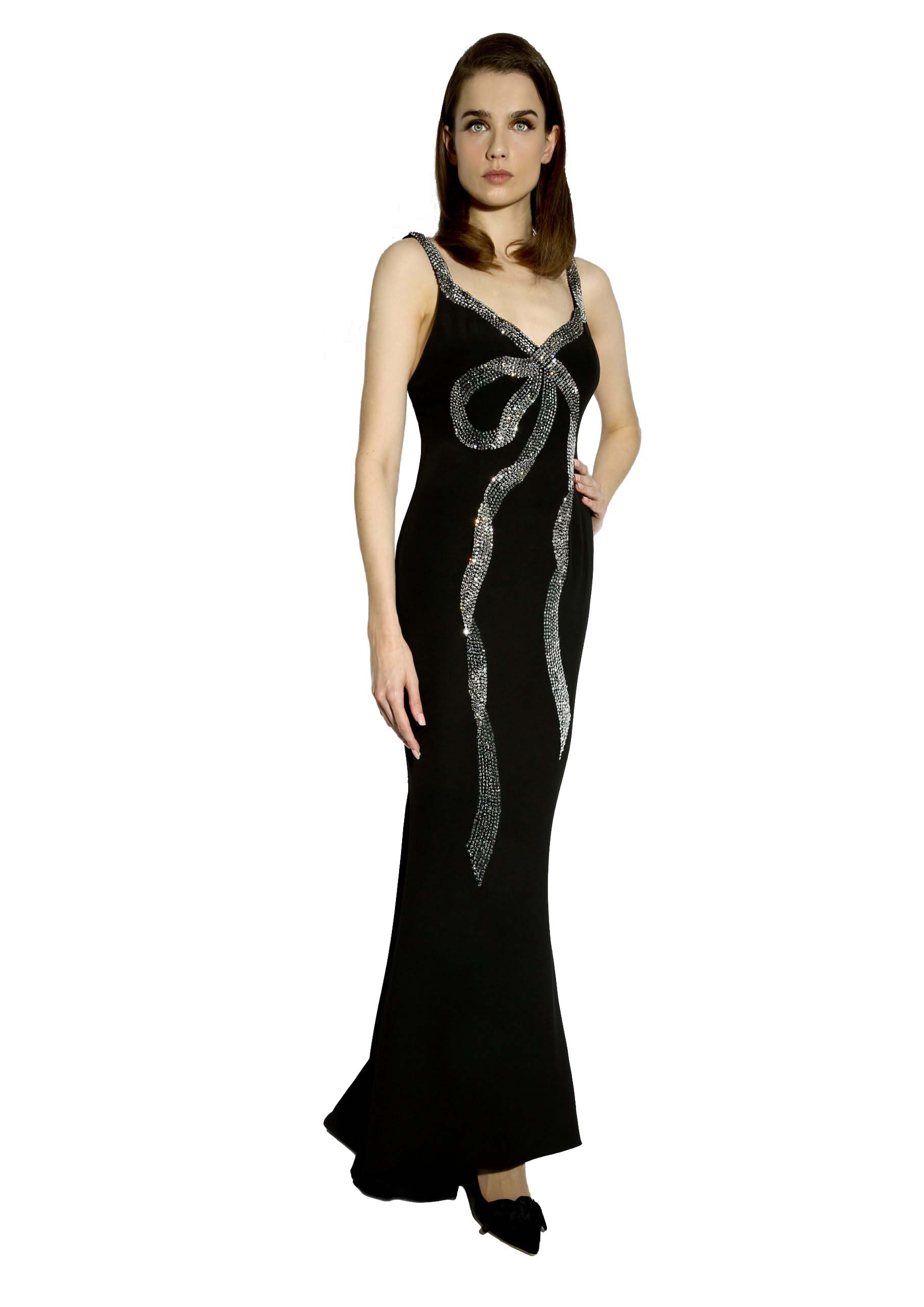 A figure-hugging midnight navy silk satin evening dress hangs on spaghetti straps and falls to a swirling fishtail