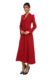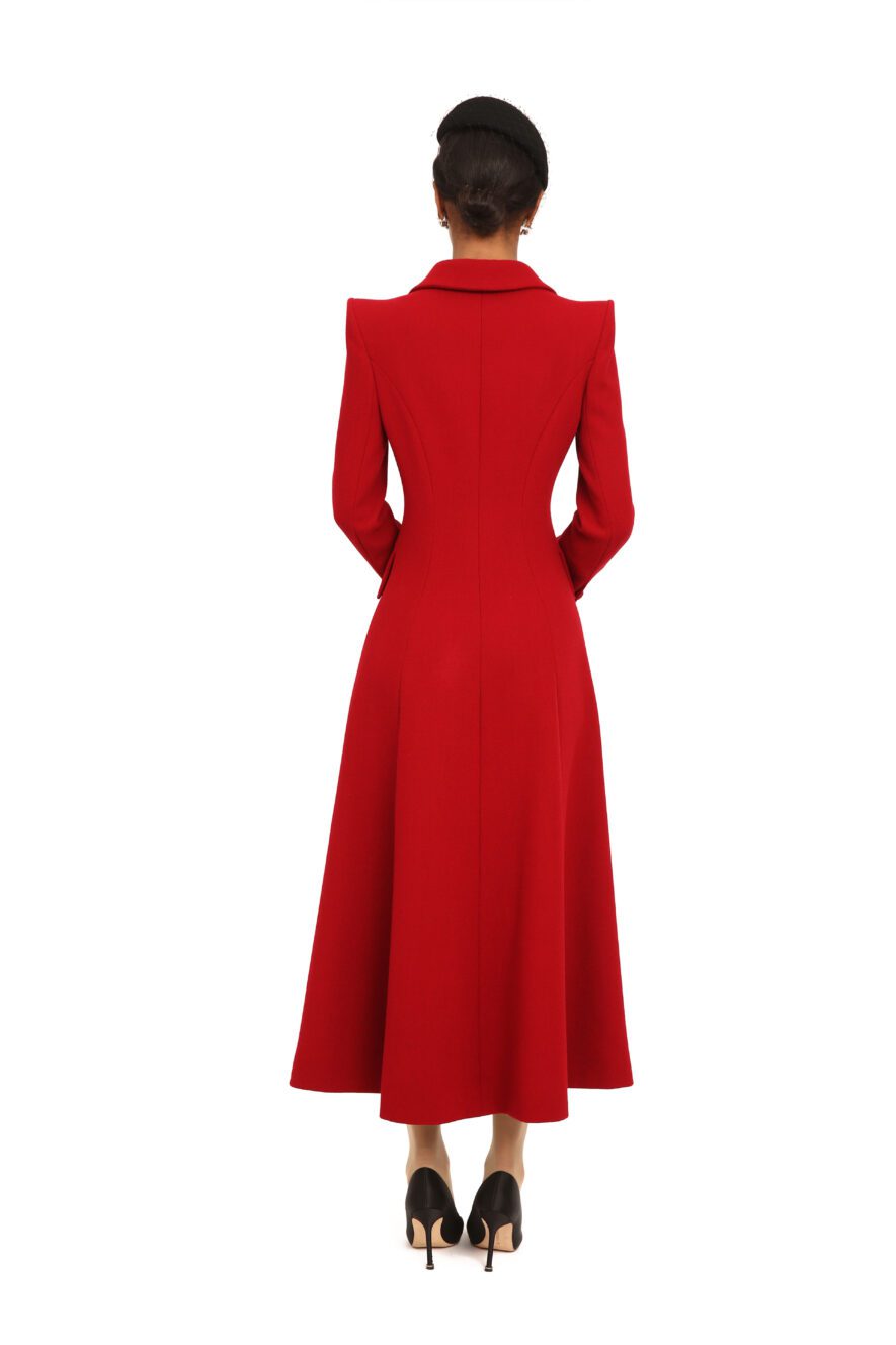This is an exquisitely tailored, full-length coatdress in a rich, classic red, designed to create a striking yet timeless silhouette. The bodice is sculpted with precise princess seams that define the waist and gently contour the torso, flowing into a softly flared midi skirt that moves with elegant fluidity.