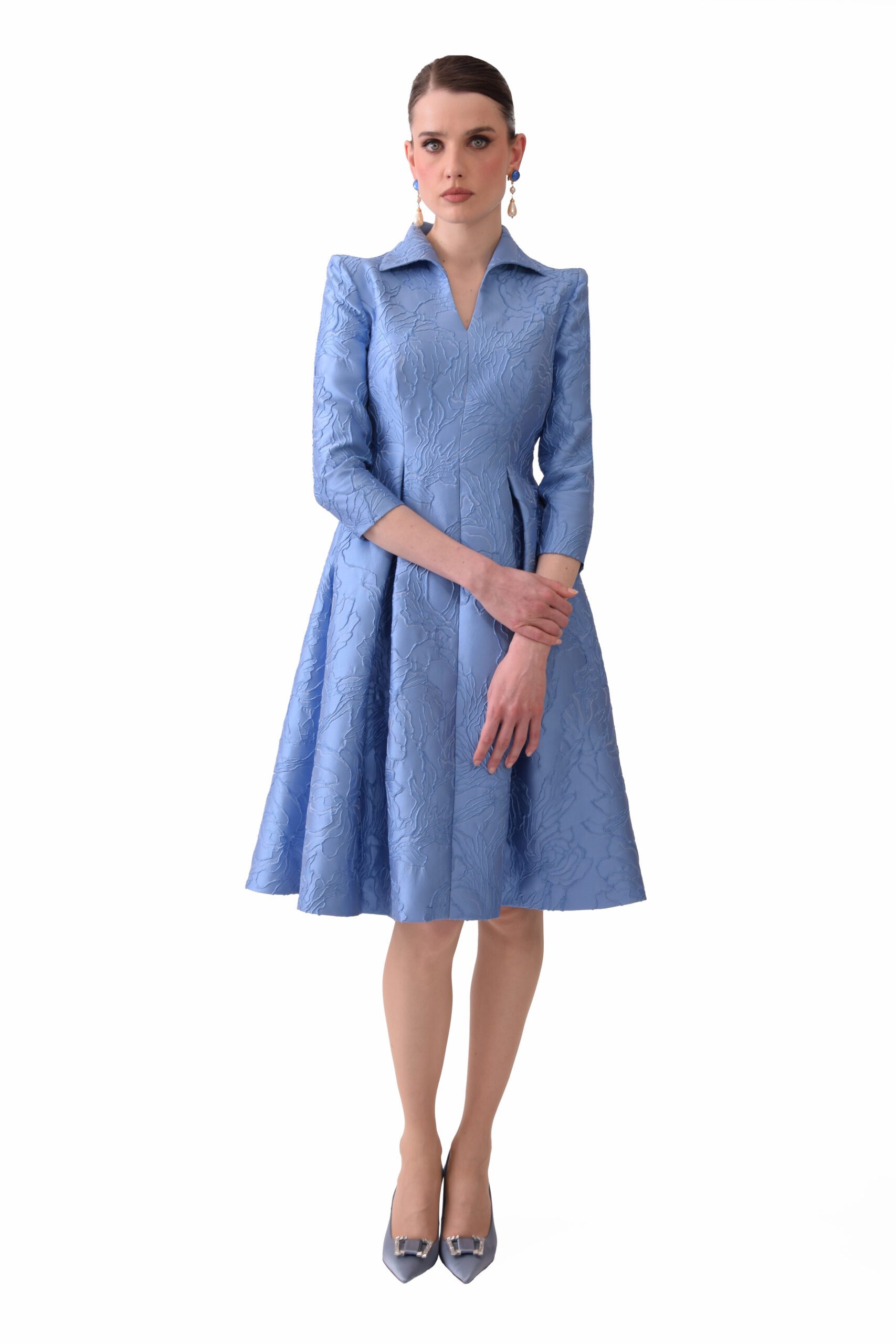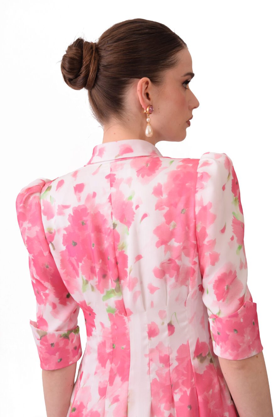 A silk georgette shirt dress with flattering pleated detailing around the waist. This design is a striking choice for the day and a beguiling look for the evening with the collar buttons undone. #S