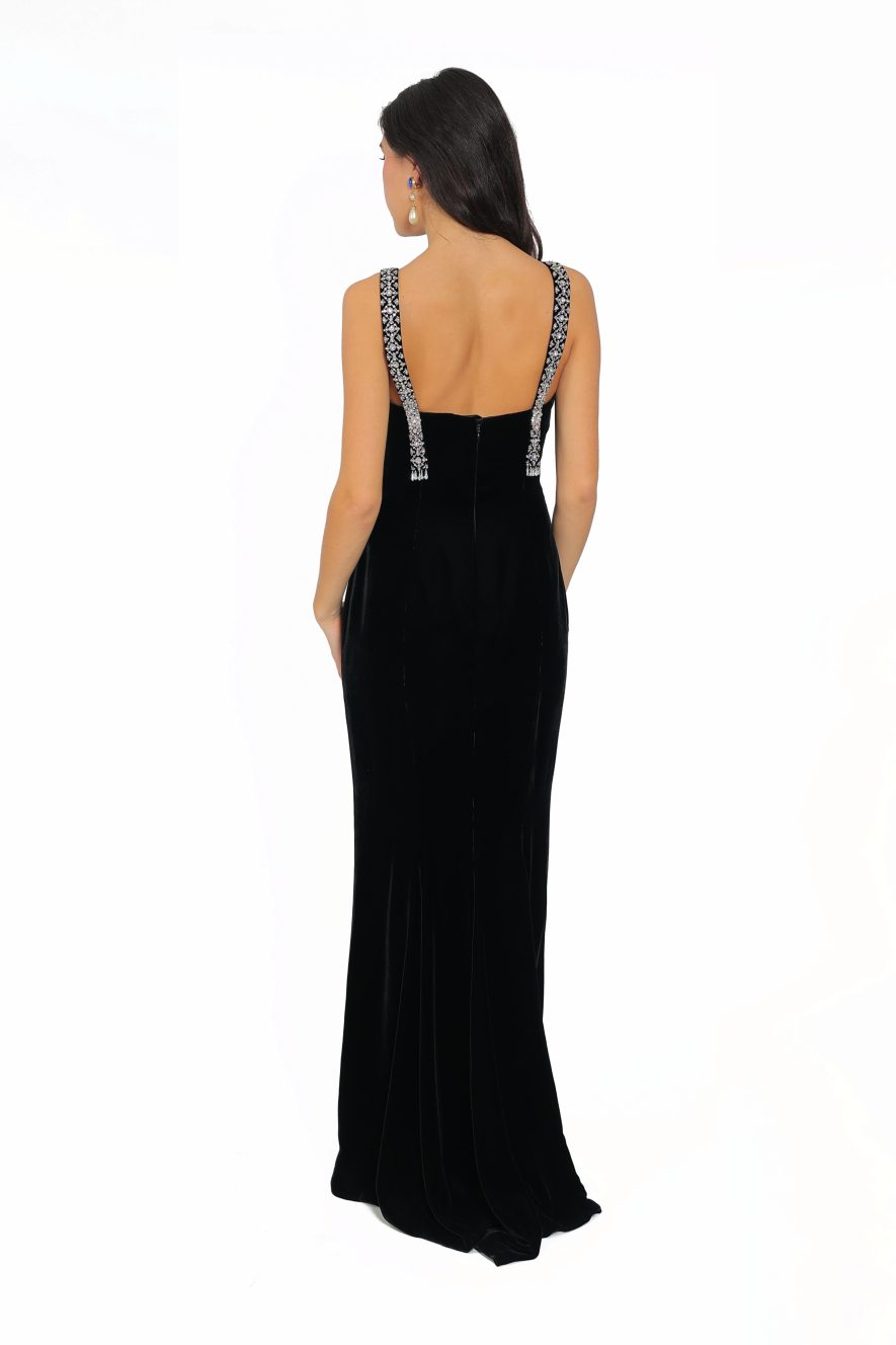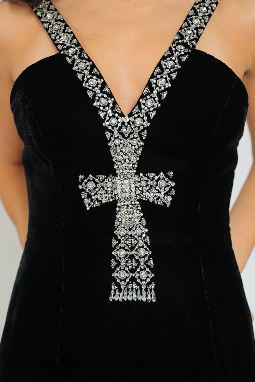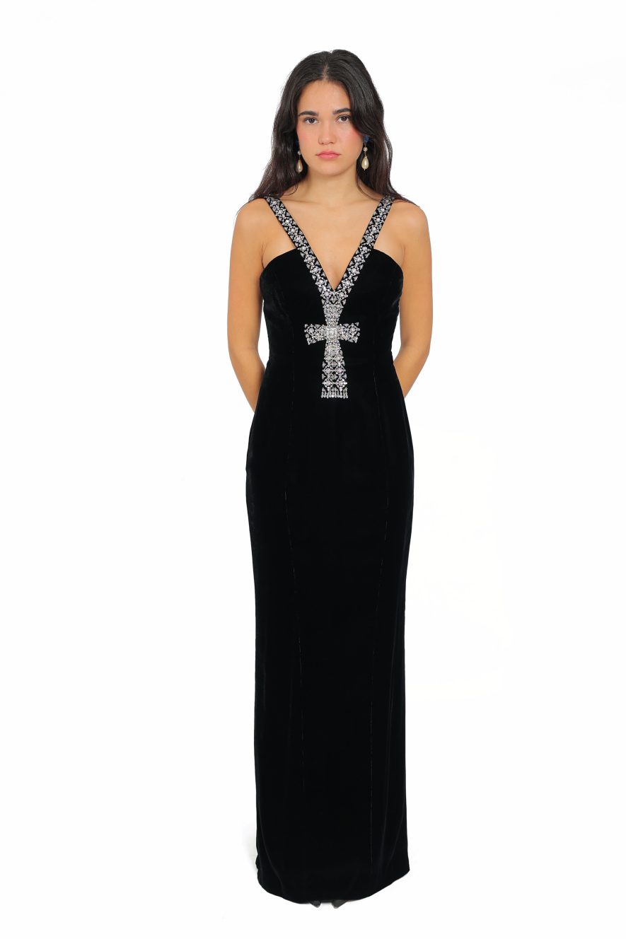 Black silk velvet gown adorned in Swarovski crystal “ankh” , inspired by the queen Nefertiti