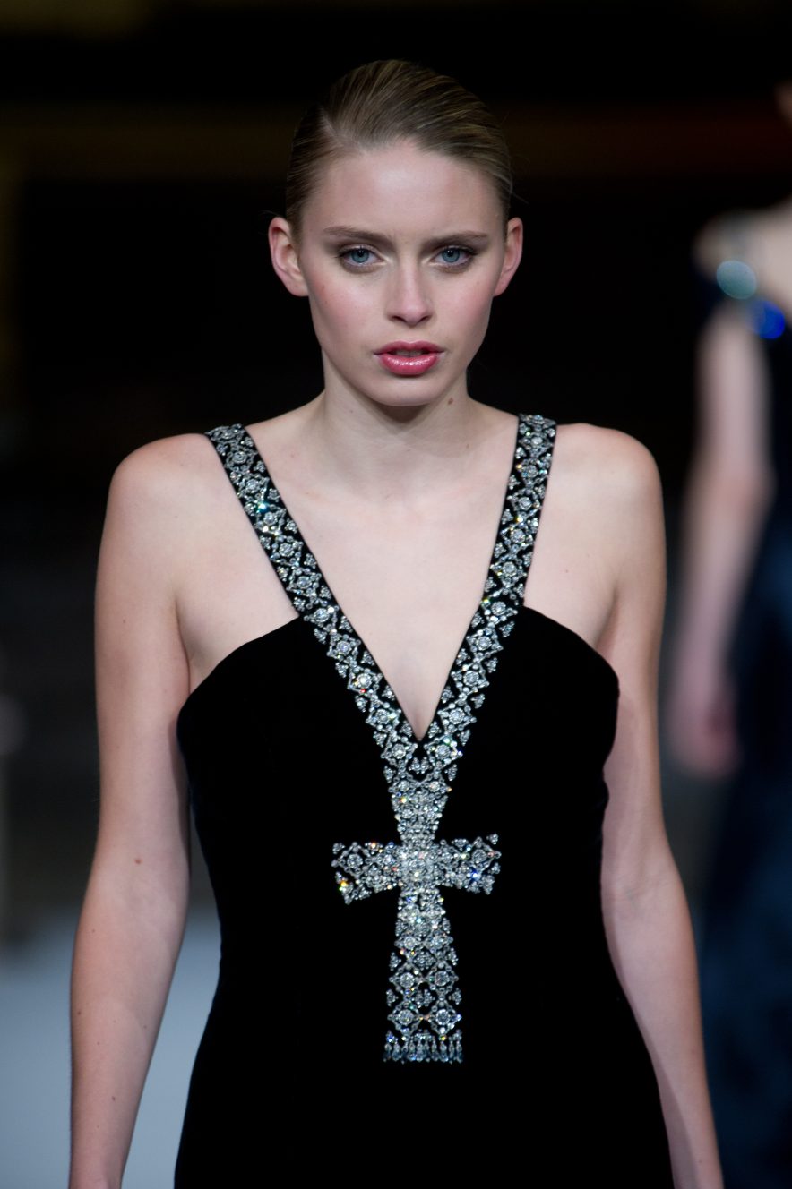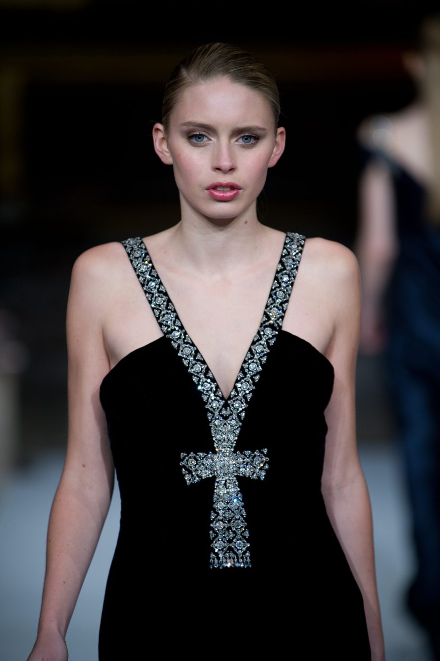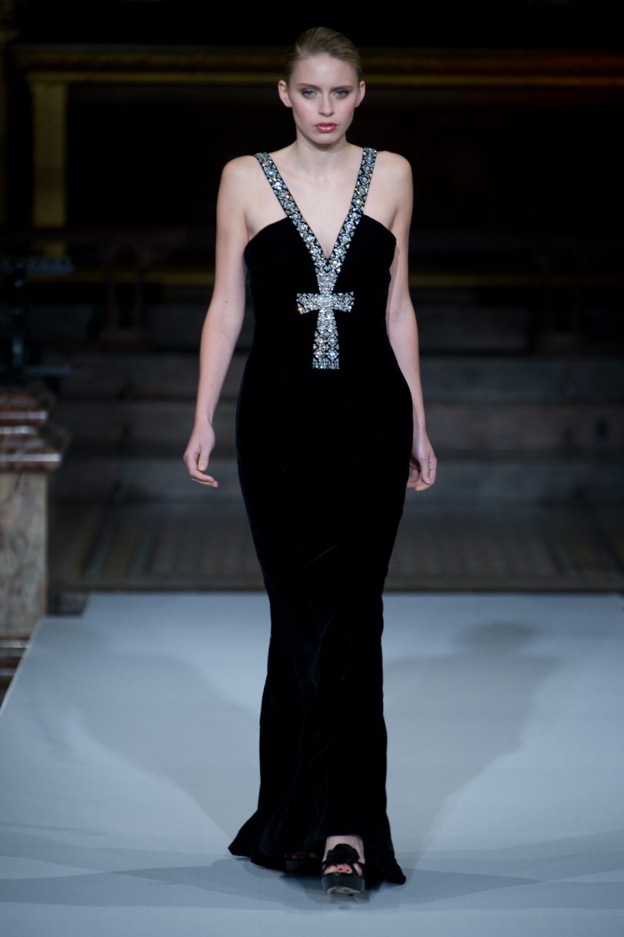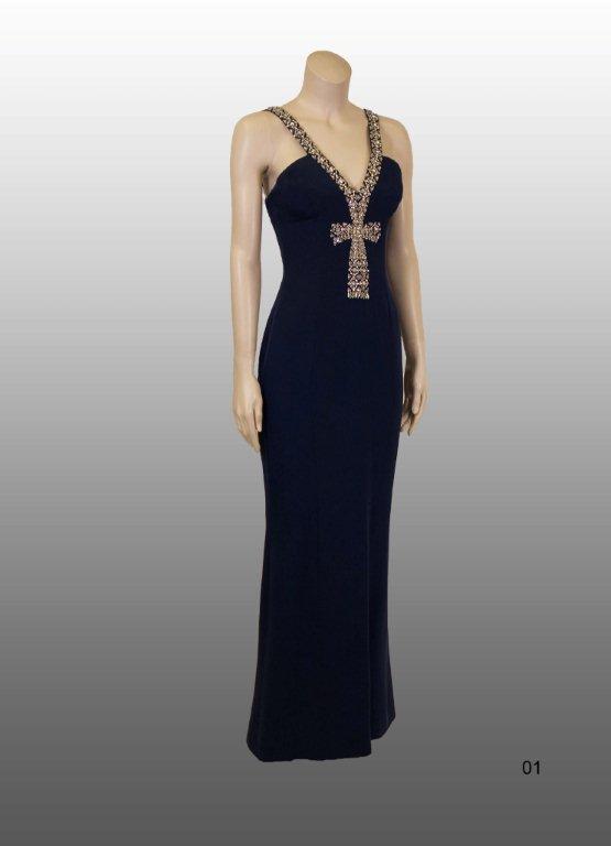 Black silk velvet gown adorned in Swarovski crystal “ankh” , inspired by the queen Nefertiti