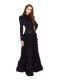 A dramatic evening gown with ink black floral printed georgette blouse with silk pussy bow, over a full skirt of hand sewn black satin leaves.