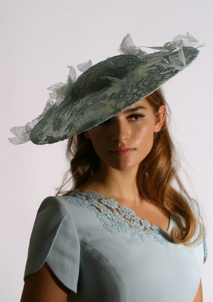 Asymmetric detailing in corded lace add interest and dimension to this pretty frosted blue wool crepe dress. Feminine tulip sleeves flatter the upper arms.