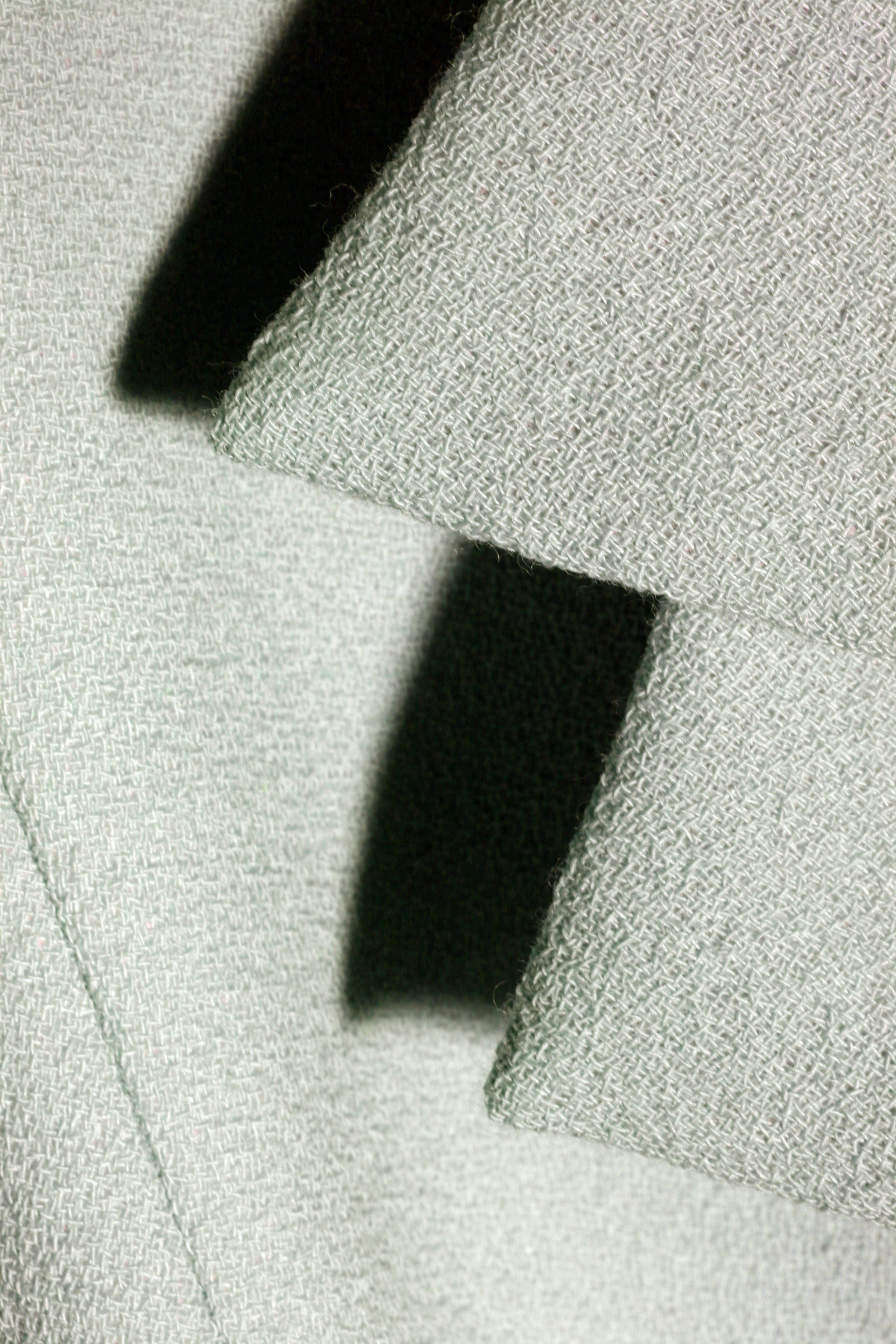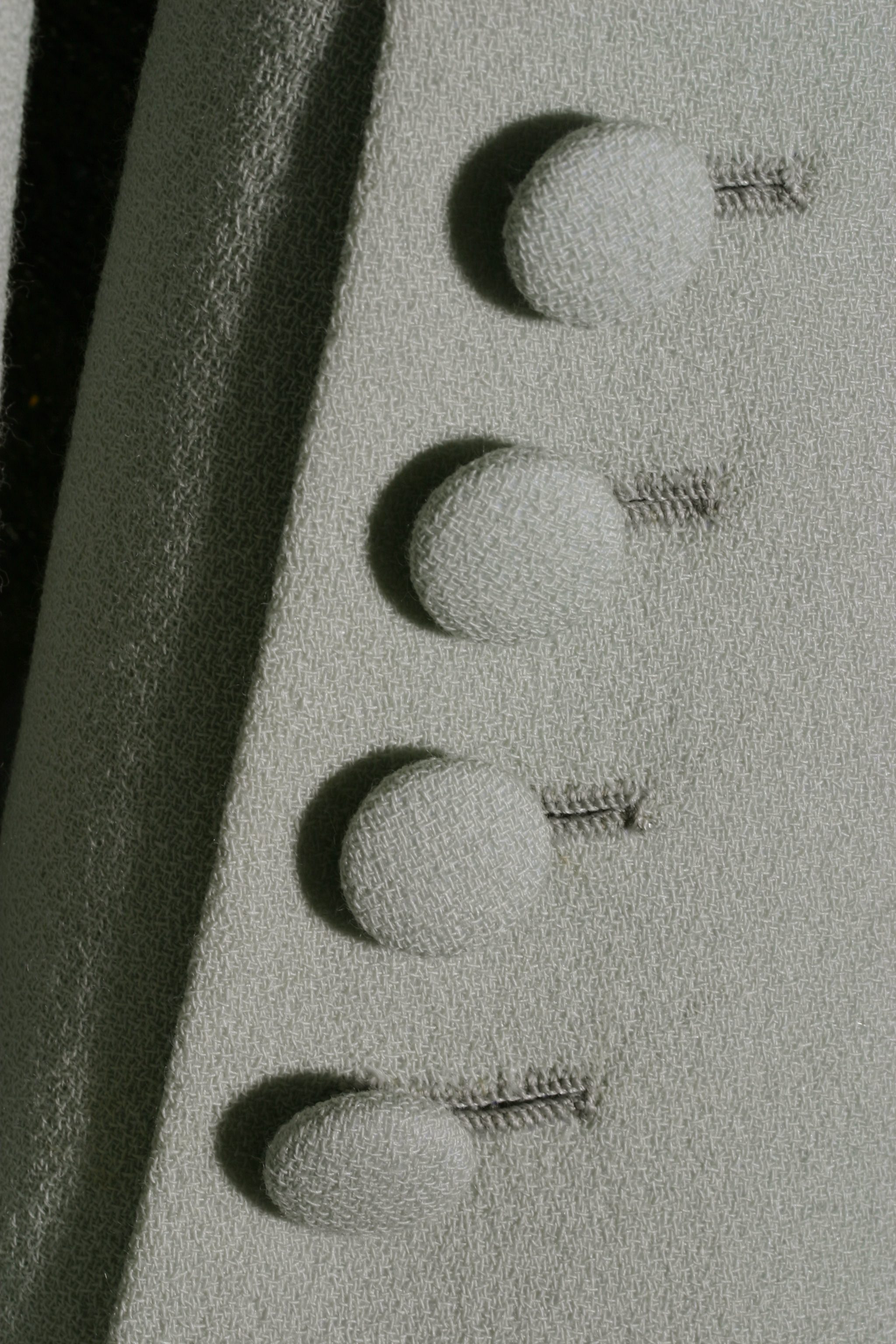 Featuring a very strong classic expertly tailored shoulder this single breasted jacket is perfectly paired with the sage green pencil skirt and playful buttons on the peplum.