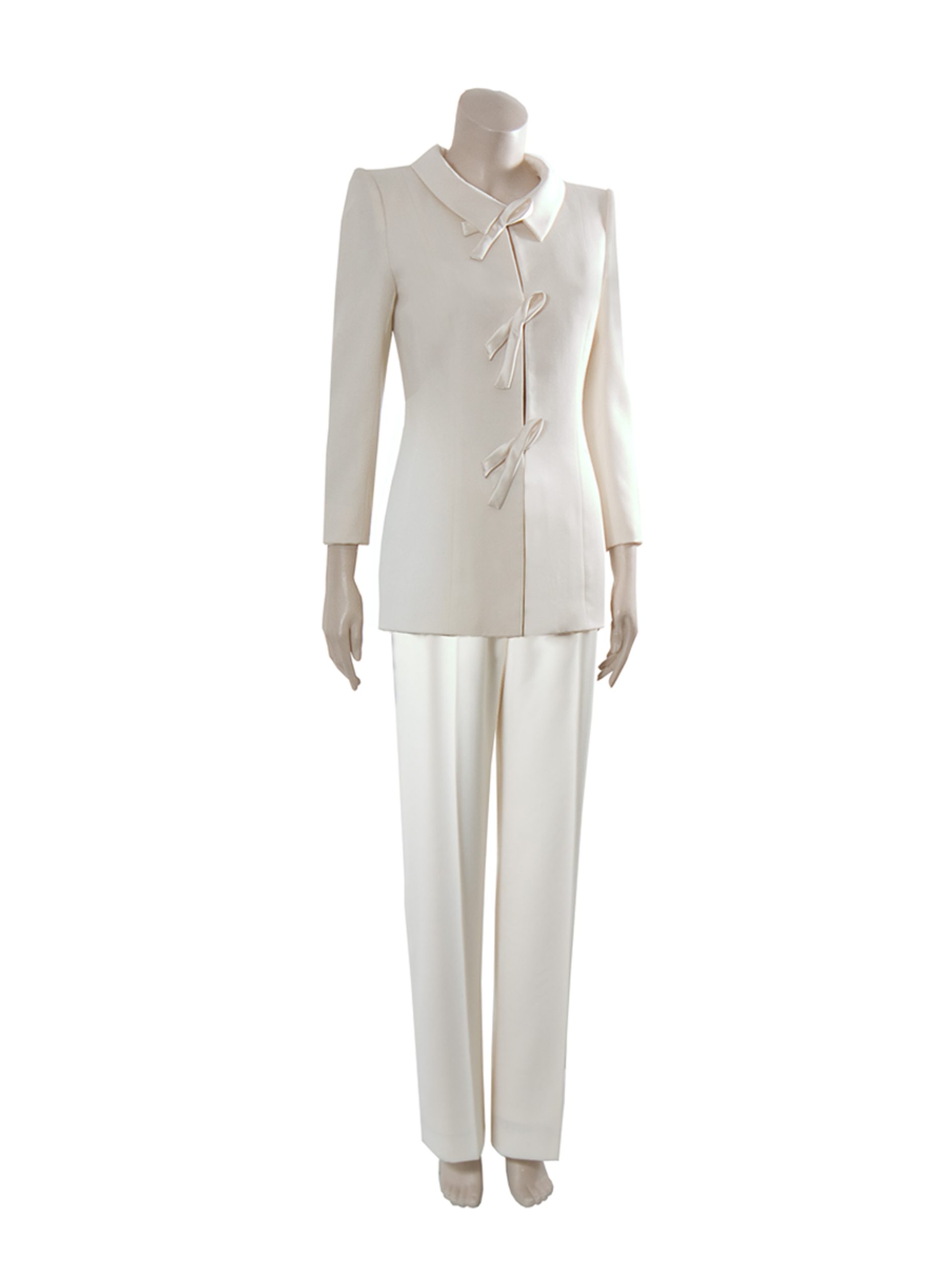 This deceptively simple classic cut tailored coatdress allows three ‘rosette’ bows to take centre stage. Available in other colours