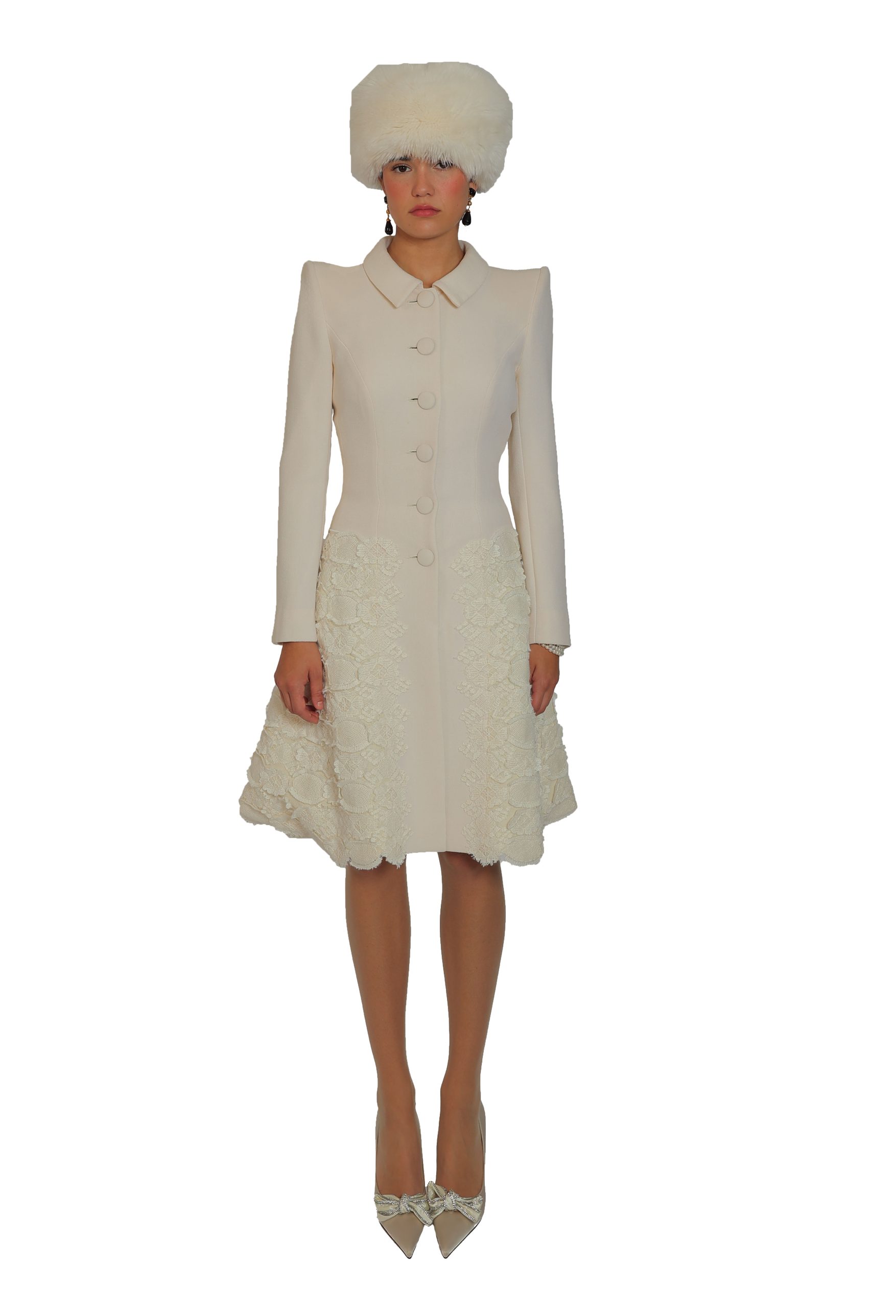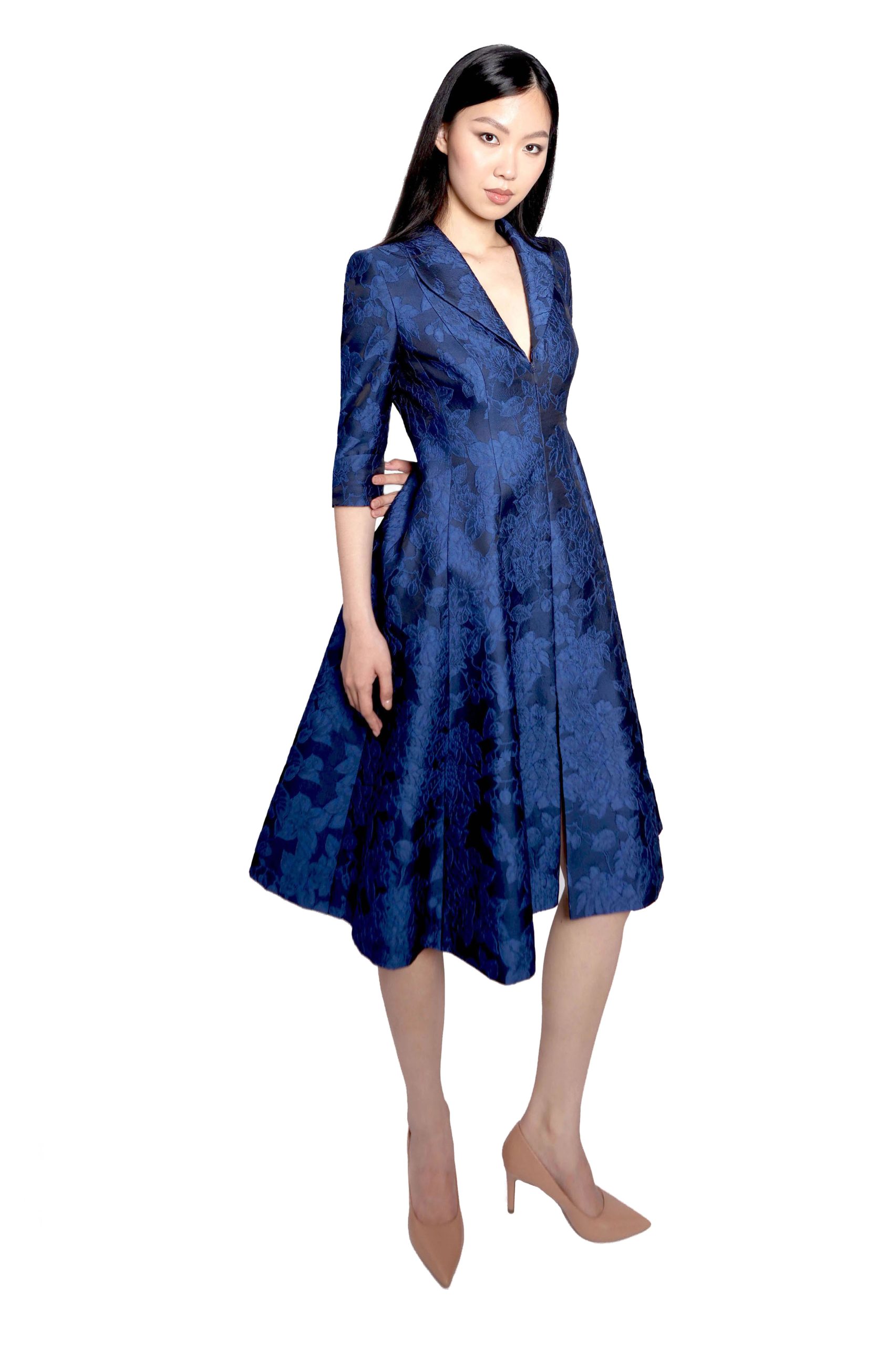 A signature occasion coatdress cut in lustrous silk and wool midnight cloque