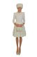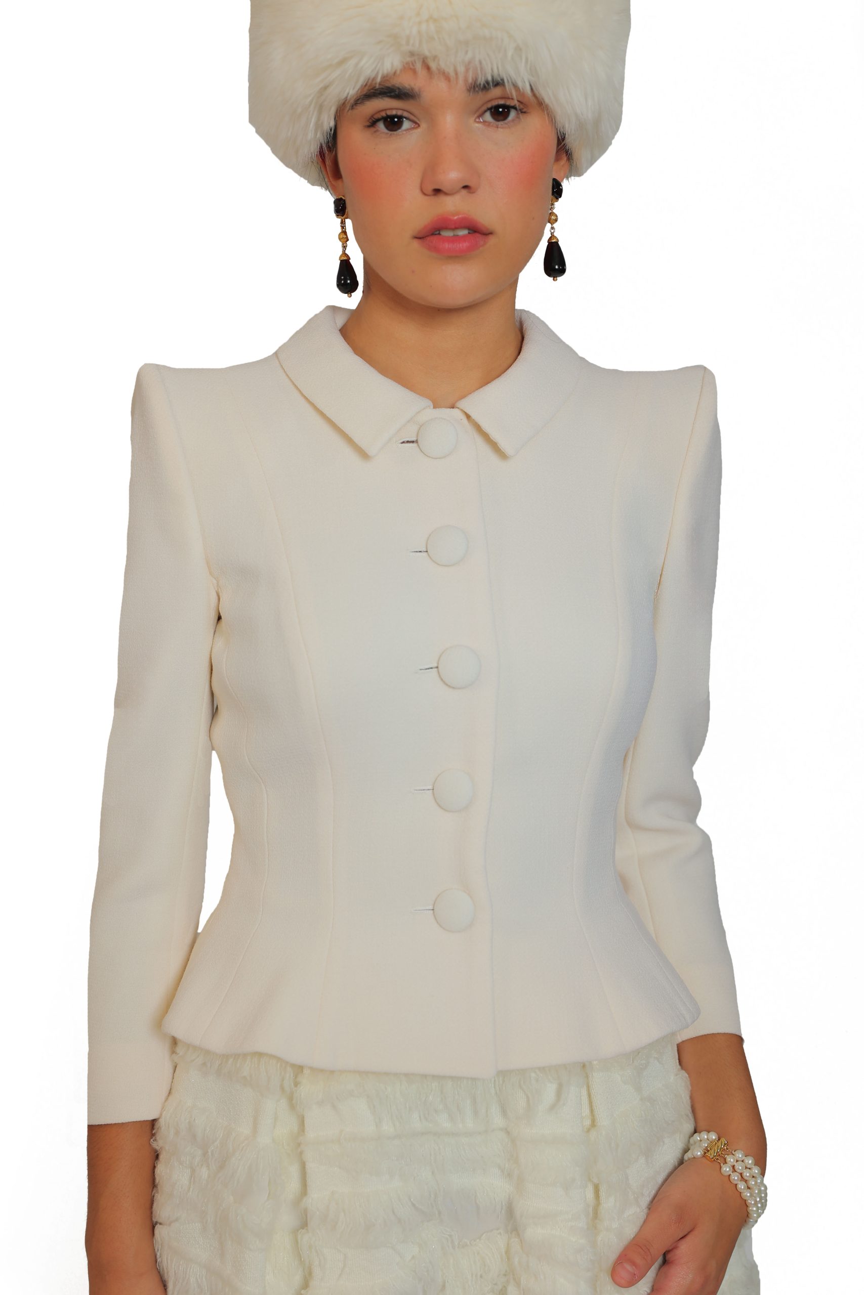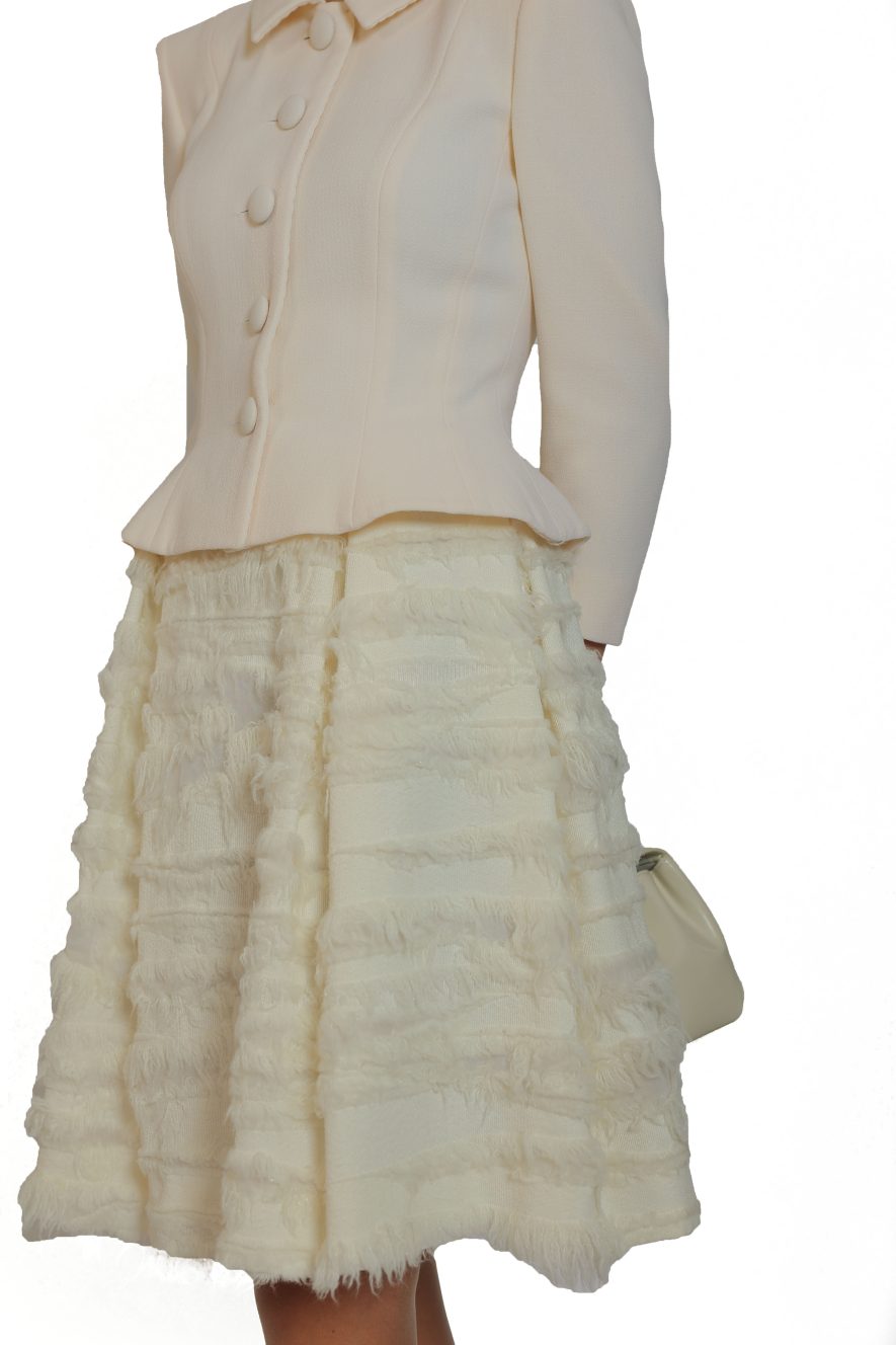 A winter white suit in wool crepe and a complex ivory fringe ribbon and lace skirt.