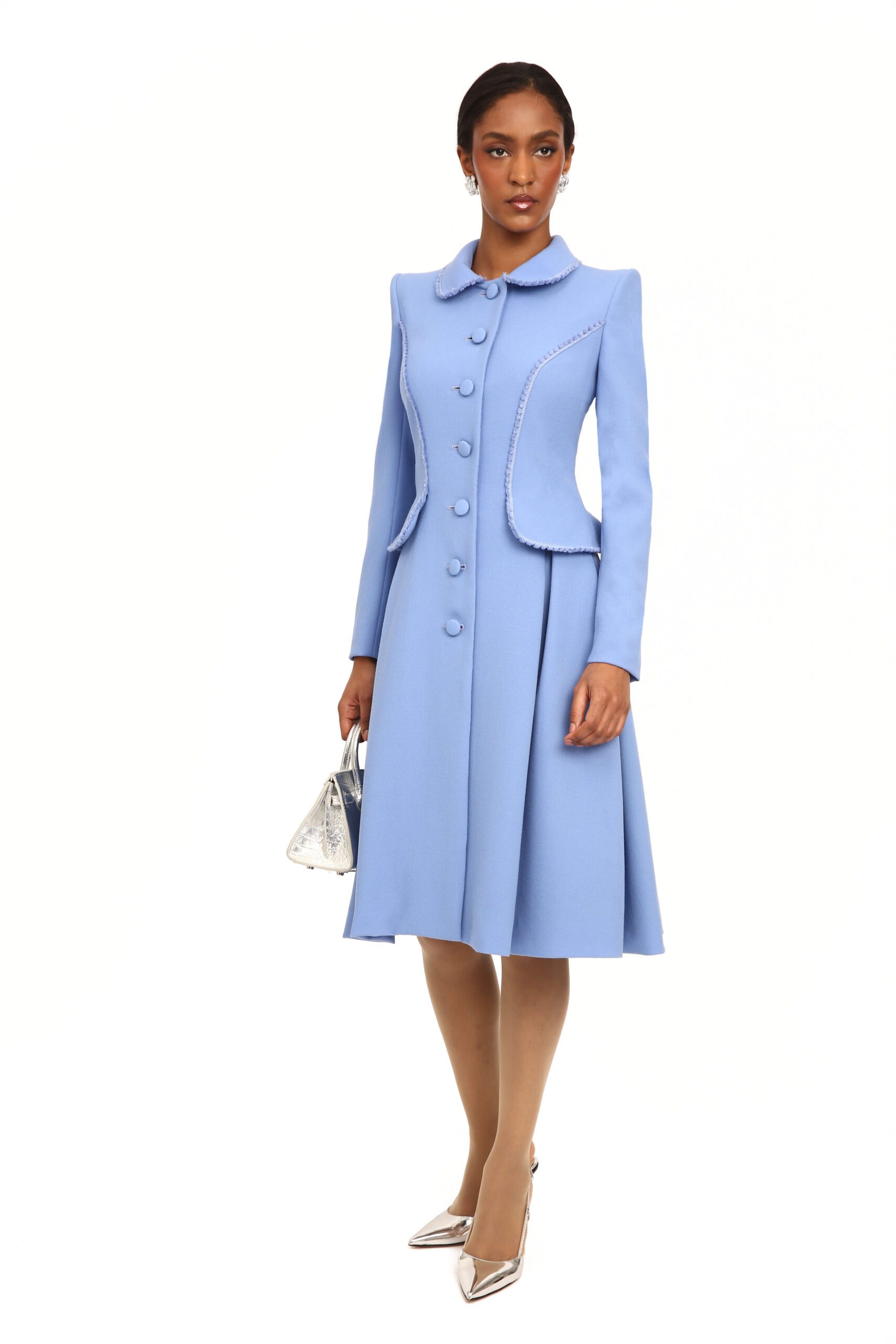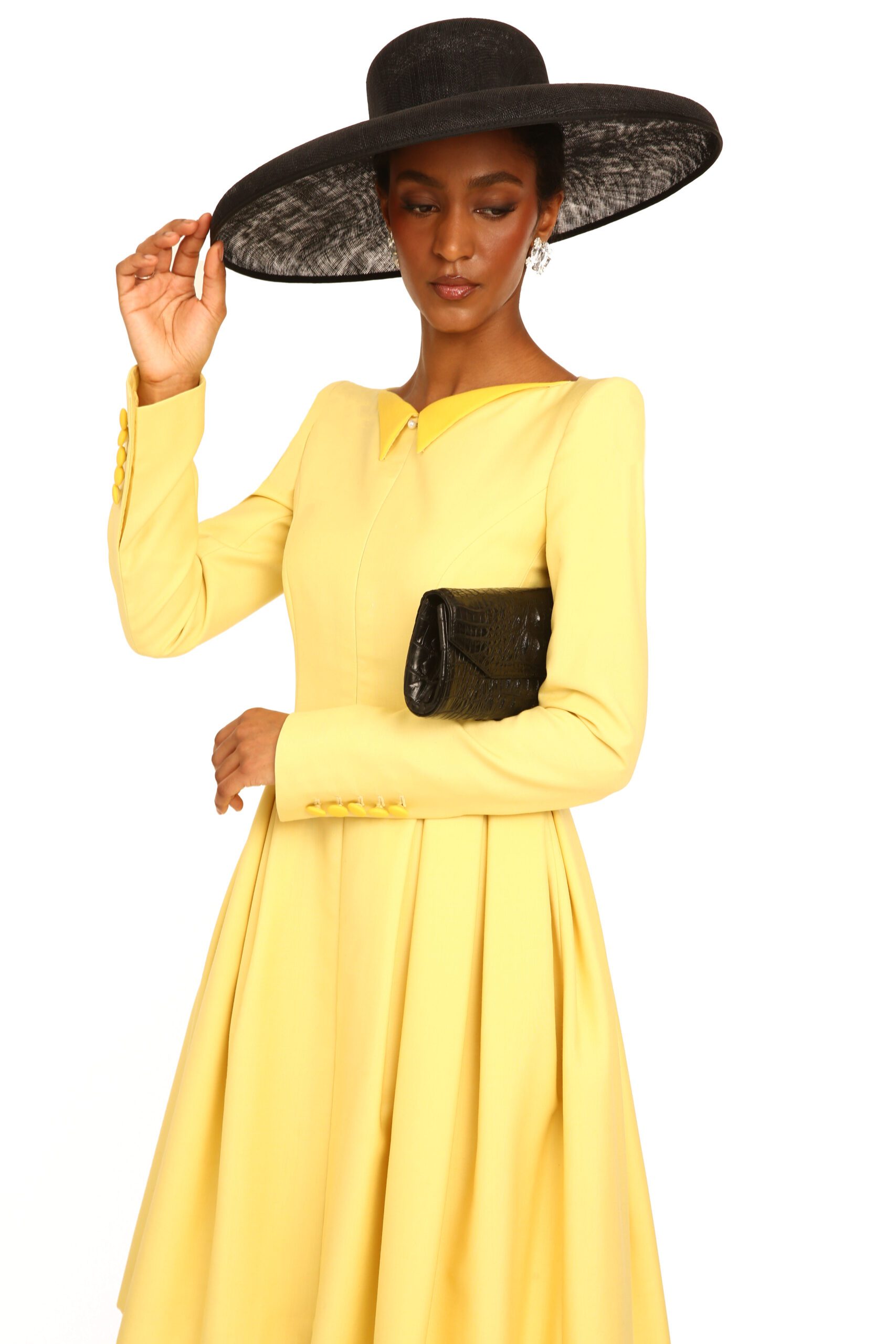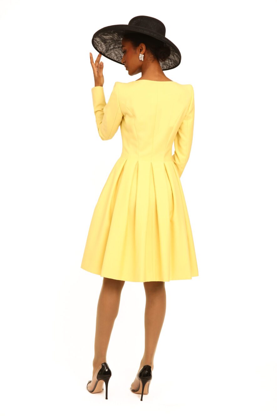 Structured, knee-length coatdress in a soft, luminous yellow. It has a fitted bodice with princess seams that shape the waist and a gently flared, pleated skirt that falls in a smooth A-line. The long sleeves are tailored and slightly slim through the arm, with subtle button detailing at the cuffs. The neckline is modest and rounded with a small, sculpted collar detail at the front, giving it a refined, vintage-inspired elegance.