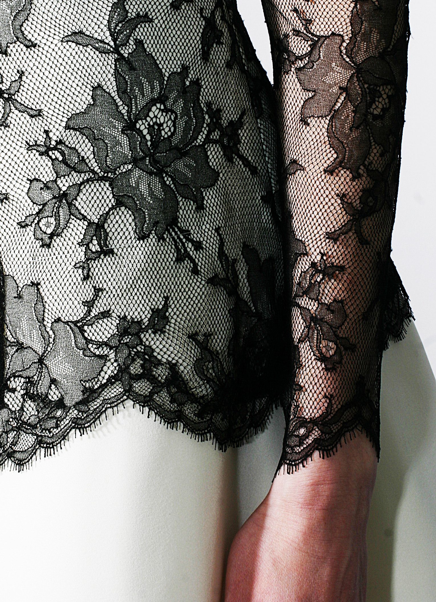 Black Chantilly lace plunges into a dramatic V on this tailored lace jacket over a bouncing, full ivory silk skirt