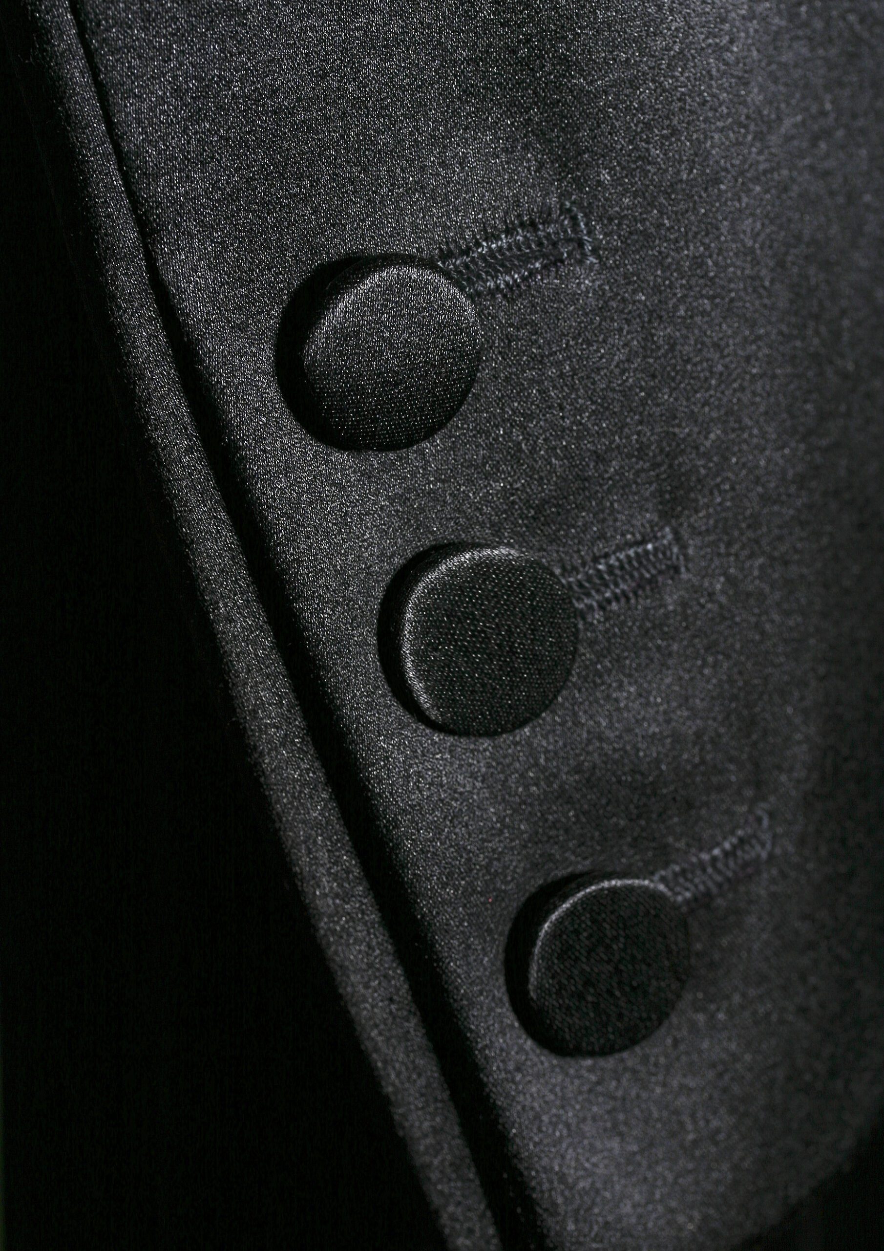 A chic black silk duchess satin single breasted evening coat with classic Catherine Walker & Co silhouette