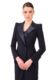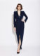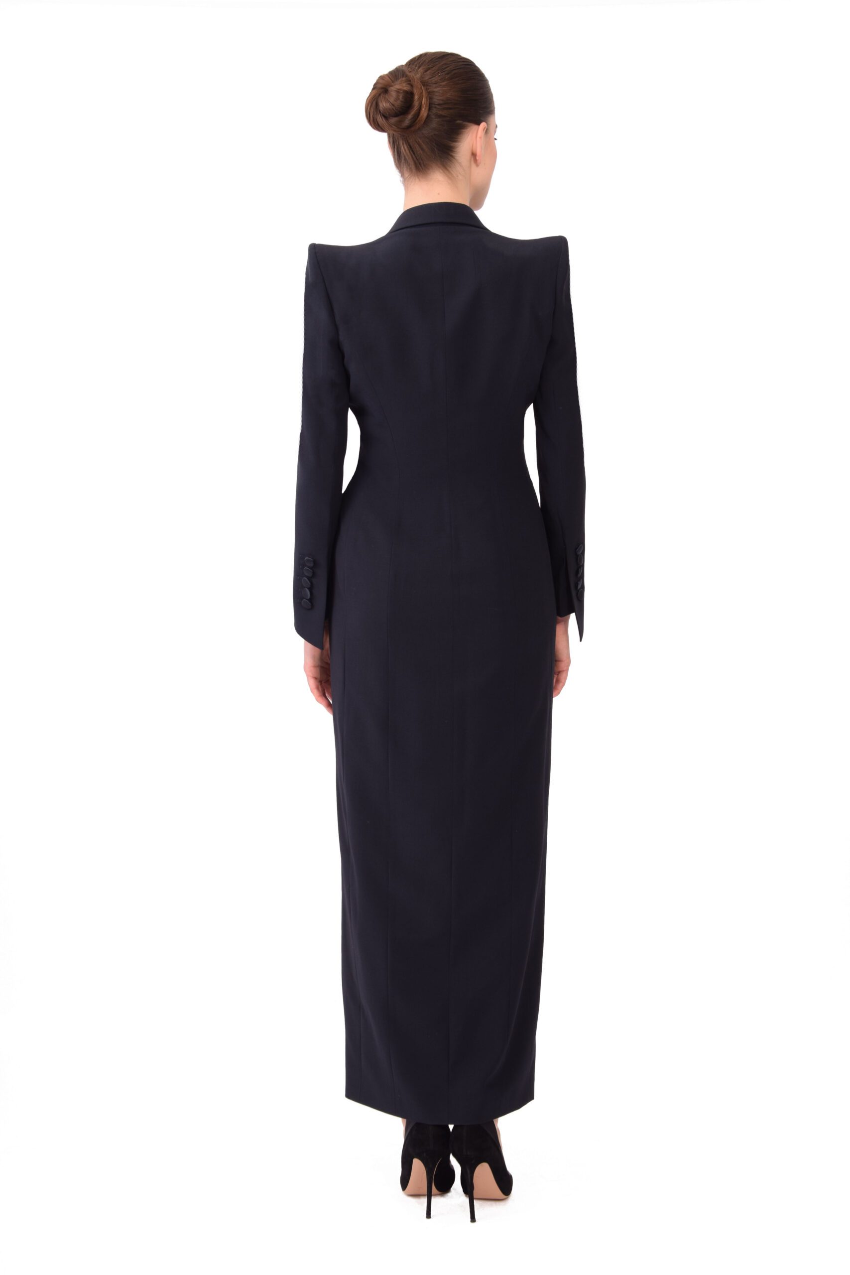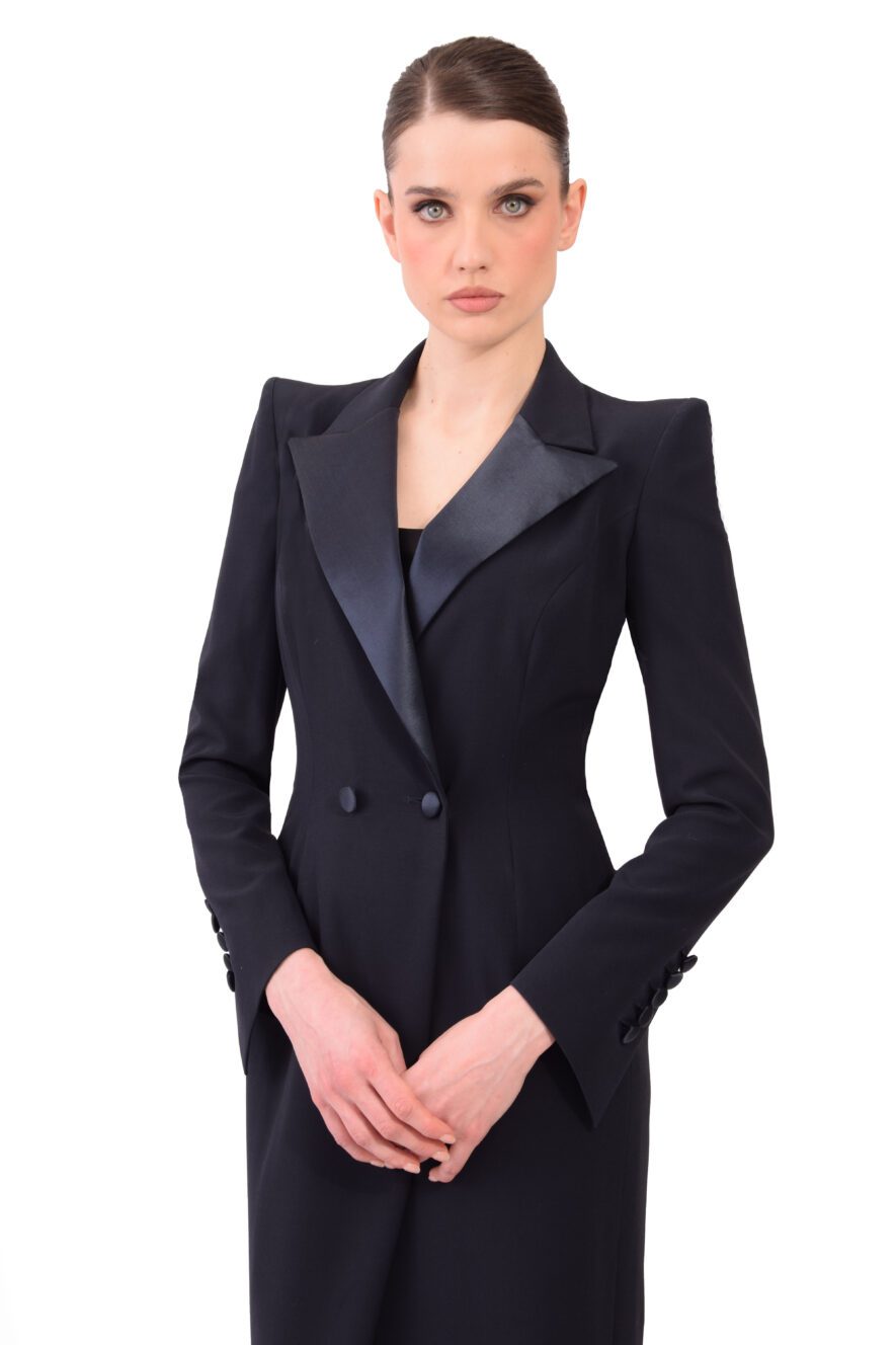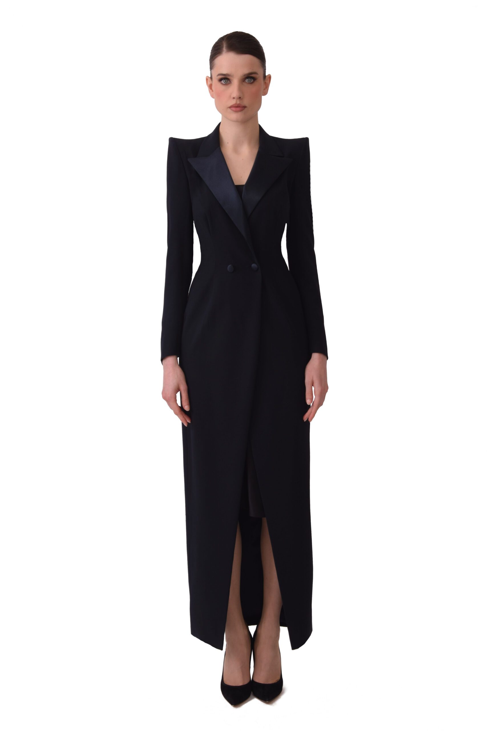 A modern take on the classic tuxedo, the Veronique evening gown is slashed seductively at the knee. Sharply tailored in deep navy wool, this elegant evening column has contrasting silk, satin lapels and covered buttons.