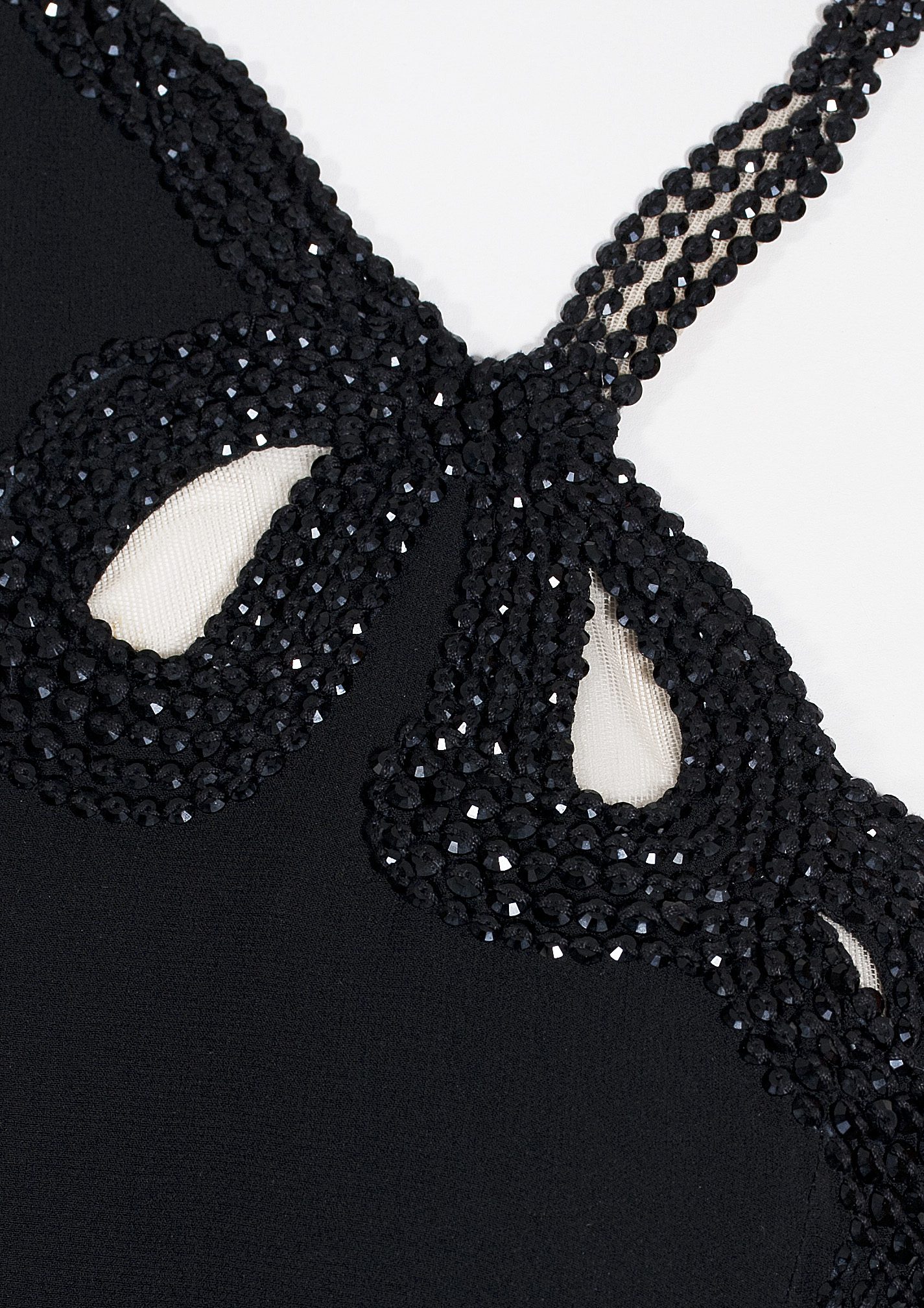 Heritage c2001. A black silk crepe column dress with inset panels of flesh-mesh bordered in bicone jet ‘ribbon’ embroidery