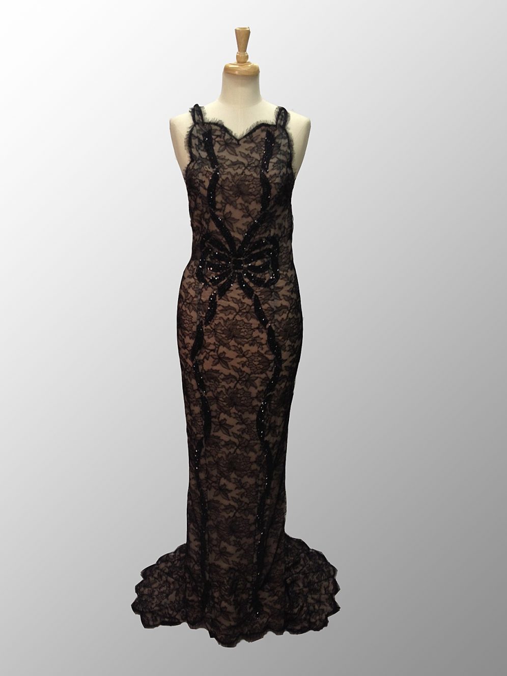 Long halter neck evening gown in black Chantilly lace with hand embroidered jet crystals forming a twisted ‘ribbon’ and ‘bow’